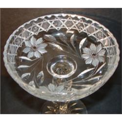 AMERICAN CUT GLASS COMPOTE with etched floral decoration on inside of bowl. 7.75" H, 6" Dia.