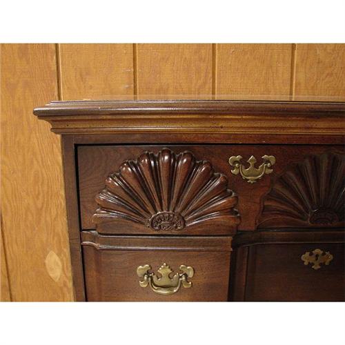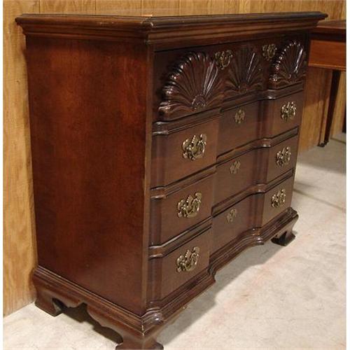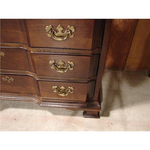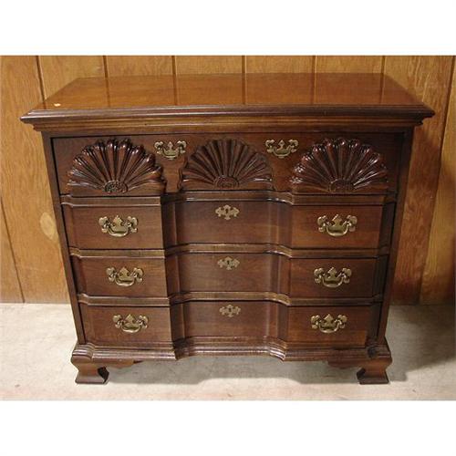 AMERICAN DREW CHERRY CHIPPENDALE STYLE BLOCK FRONT CHEST. Shell carvings at top drawer. Has four dovetailed drawers. Raised on ogee bracket feet. Marked on inside of top drawer. 32.5” H, 36.75” W, 16” D