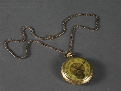 American Elgin ladies' pocketwatch dated by serial nmber to 1922, grade 315, size 12s, with a 15 jewel movement. Does not run. 1.75'' D; brass chain included.
