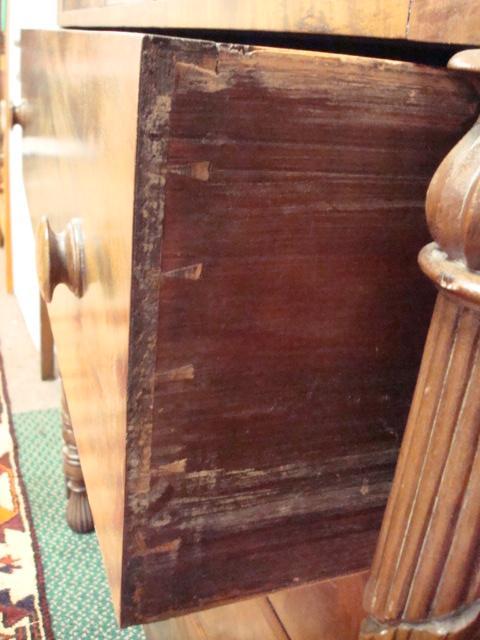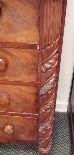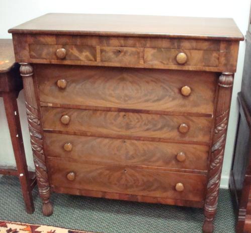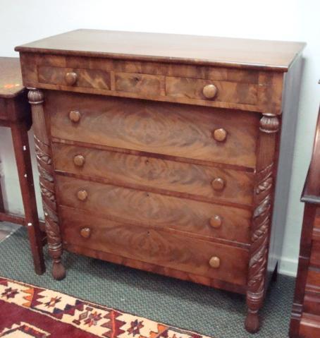 AMERICAN EMPIRE Seven Drawer Chest: Projecting Top Three Side by Side Drawers over Four Stacked Below. Flame Grain on Front. Wooden Knobs on Drawers. Shrink Split on Top. Fully Carved Outstanding Columns at Sides. 51"T X 47"W X 21"D. All Original.(1500-3000)