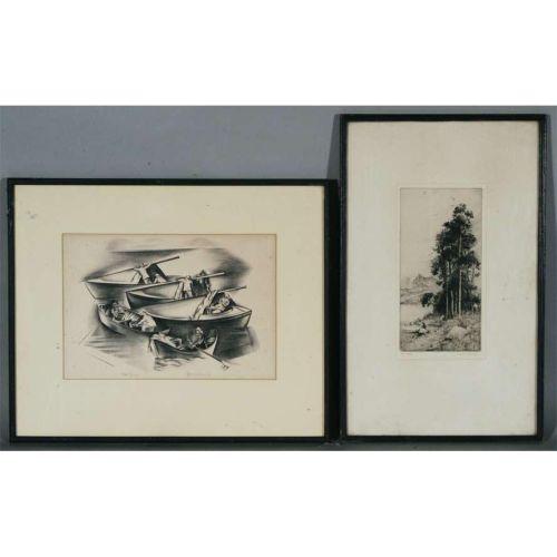 1 AMERICAN ETCHINGS (2) Jackson Simpson, Ben Nevis Ryah Ludins, Dories each pencil signed CONDITION REPORT: minor mat burn and foxing. PACKING AND SHIPPING (excluding insurance) by Fairfield Auction to points within the Continental U.S.A. and Canada (all other international must be handled by 3rd party shipper) $40.