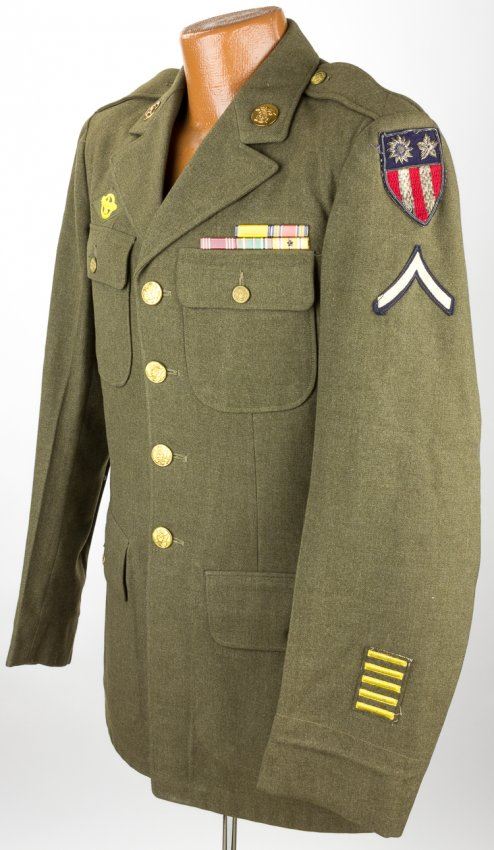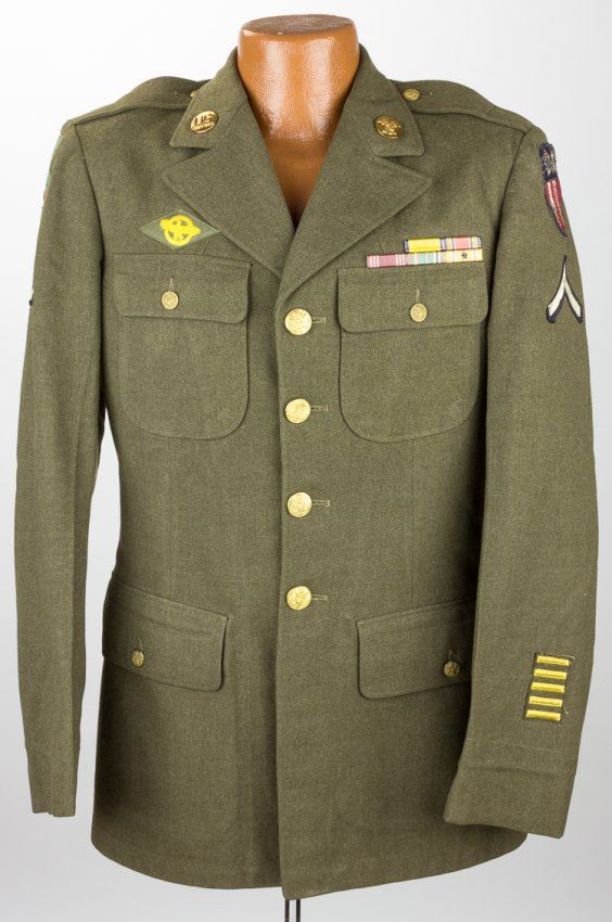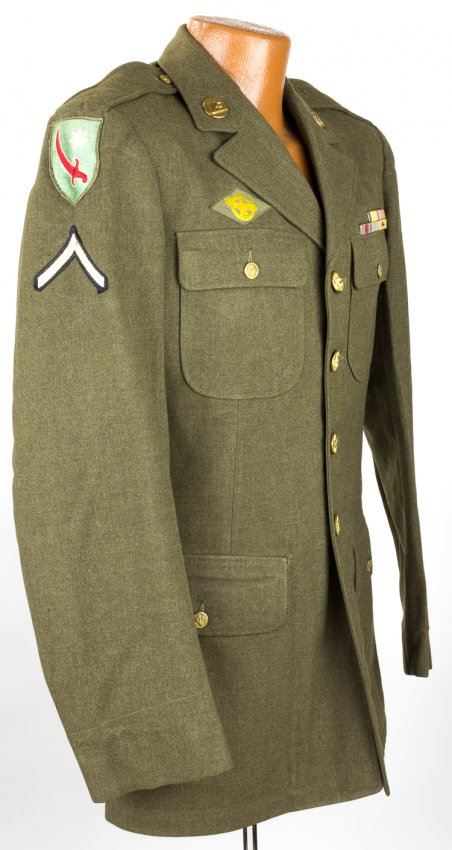 American army private's dress tunic, green wool, the soldier a member of the Quartermaster Department. All insignia present including the uncommon Persian Gulf patch on right shoulder, with six gold service stripes on sleeve and ribbon bars. Fine.