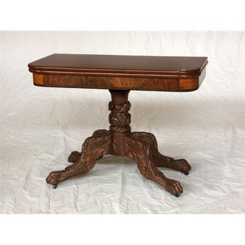 GAME TABLE: American late Federal circa 1830-50, mahogany game table, modified D form top above a mahogany crotch-grain and bird's eye maple frieze, baluster turned and acantus standard, four sroll form legs with acantus leaf knees and hairy paw feet. Table refinished. 28''h x 18''d x 37''w