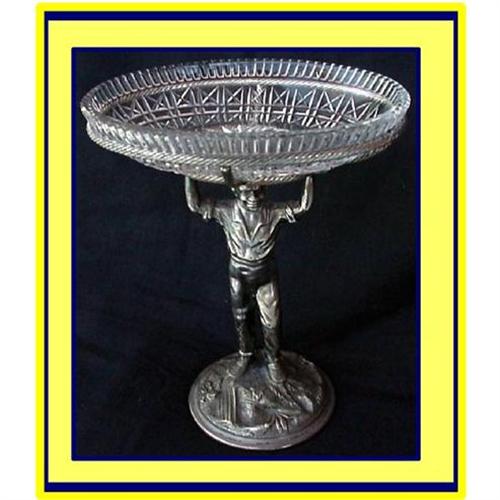 Cut glass and silver plate centerpiece in the form of a Black slave holding a bowl above his head. American, 19th century. Use for mints/candy or calling cards. 6 5/8inches high. Bowl is almost 5 1/2inches long. Figure stands on a round, naturalistically moulded base. He wears simple workman's trousers and open shirt with rolled up sleeves. Steriotypical features such as curly hair etc Silver holder with rope form holds a cut glass, oval bowl. Condition is very good. Glass has no chips/cracks. Figure has no damage. Silver on base is slightly worn, commensurate with the age of the piece.