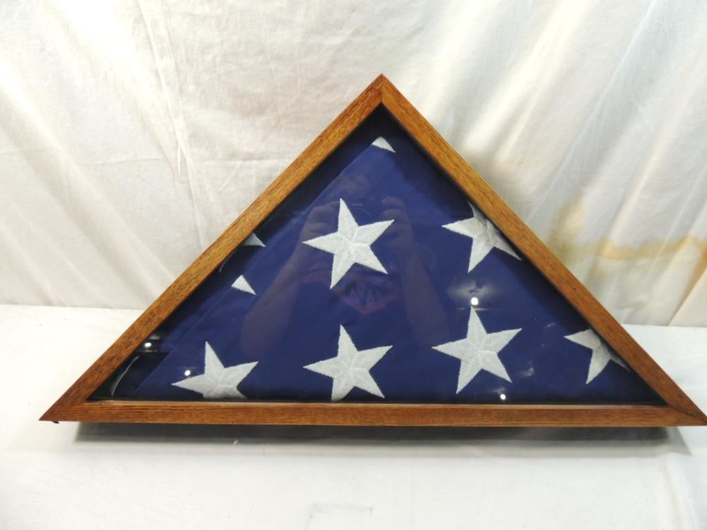 MILITARY FLAG, MEMORIAL FLAG, DISPLAY CASE, WOODEN CASE, DISPLAY CASE, MILITARY HONORS FLAG, AMERICAN FLAG IN DISPLAY. AS SHOWN SEE PHOTO FOR MORE DETAILS.