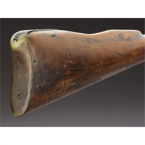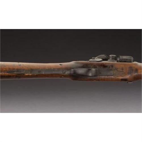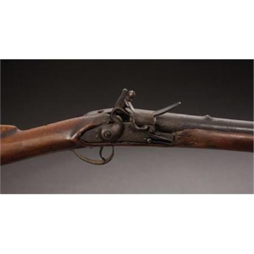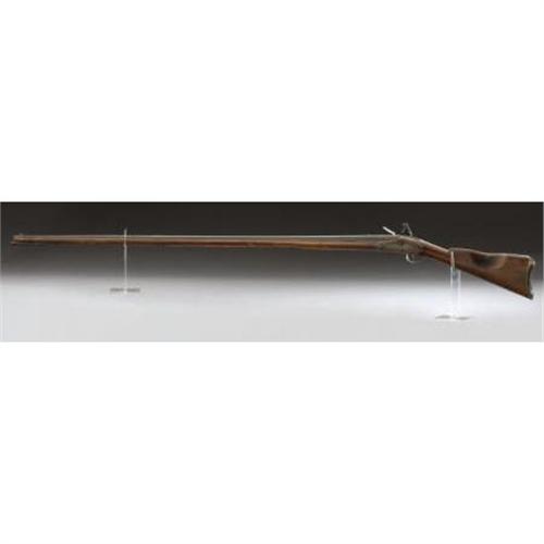 <B>AMERICAN FLINTLOCK FOWLER.</B></I> Late 18th or early 19th century. 53¼ “ barrel; overall length is 69". The barrel is secured to maple stock with pins; and the gun has a brass biteplate. Early type. Non-reinforced hammer.<BR><BR><B>Condition: </B></I>The trigger guard was originally brass, but was replaced with a hand-forged iron guard, which appears to have been done during the period of use. A 1½" section of the original brass guard remains in place. Butt plate dented at upper rear area ¾ “by ¾”. The stock is missing some areas of wood at the flocculate, and has a crack from the bite plate to the rear of the trigger guard on the left side. The hammer will not hold on full cock, and there is a rear tang screw missing. There is a very nice old patina on the wood and metal. The wooden ramrod appears correct and shows great age. The lock is possibly a very well done reconversion.<BR><BR><b>Shipping:</b> Requires 3rd Party Shipping (<a target="_blank" href="http://www.heritageauctions.com/common/shipping.php">view shipping information</a>)