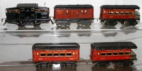 AMERICAN FLYER PREWAR O GAUGE 0-4-0 ELEC. LOCO WITH 4 LITHO PASS. CARS.