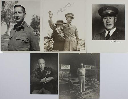 Lot of five signed photographs of prominent American generals, includes: JONATHAN WAINWRIGHT (1883 - 1953) "Skinny", American general who defended Bataan and Corregidor after MacArthur's withdrawal early in World War II, S.P. 8" x 10" b/w, waving to crowd following his liberation; MARK CLARK(1896 - 1984) American Army general, commanded the landings at Salerno and Anzio against the forces of Kesselring, war-date I.S.P., 8" x 10" b/w, chest, up pose with typed inscription to a fellow officer, Italy, Oct. 3, 1944; OMAR N. BRADLEY (1893-1981) American general of World War II who commanded the largest ground force ever led by one man. He was later Chairman of the Joint Chiefs. S.P. 5" x 7" b/w, a printed photo signed in blue ink; KELLER E. ROCKEY(1888-1970) Commander 5th Marine Div. at Iwo Jima. S.P. 8" x 10" b/w, a copy of a pre-war photo in uniform, nicely signed; and ROBERT EICHELBERGER, (1886-1961) General who commanded the 8th Army in the South Pacific. S.P. 7 1/2" x 8 1/2" b/w, a candid photo outside his headquarters, mounted. Overall very good to fine.