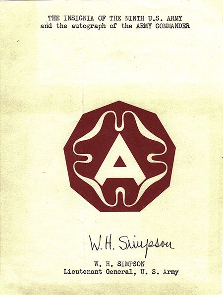 Lot of three signed items, includes: WILLIAM H. SIMPSON (1888-1980) Commander of the Ninth Army, insignia of the Ninth Army on an octavo sheet, signed at bottom (war-date), LEONARD T. GEROW (1888-1972) Lieutenant general, commander of the V Corps and the first corps commander ashore on D-Day, considered by Eisenhower one of the best fighting officers in his command, signature on a prepared card; and LEWIS H. BRERETON (1890-1967) American general who served in every theater, saw the destruction on the ground of much of the Army Air Forces in the Philippines, and participated in Operations Tidal Wave, Cobra, and Market-Garden, hurried war-date signature at the top of an envelope. Three pieces, very good.