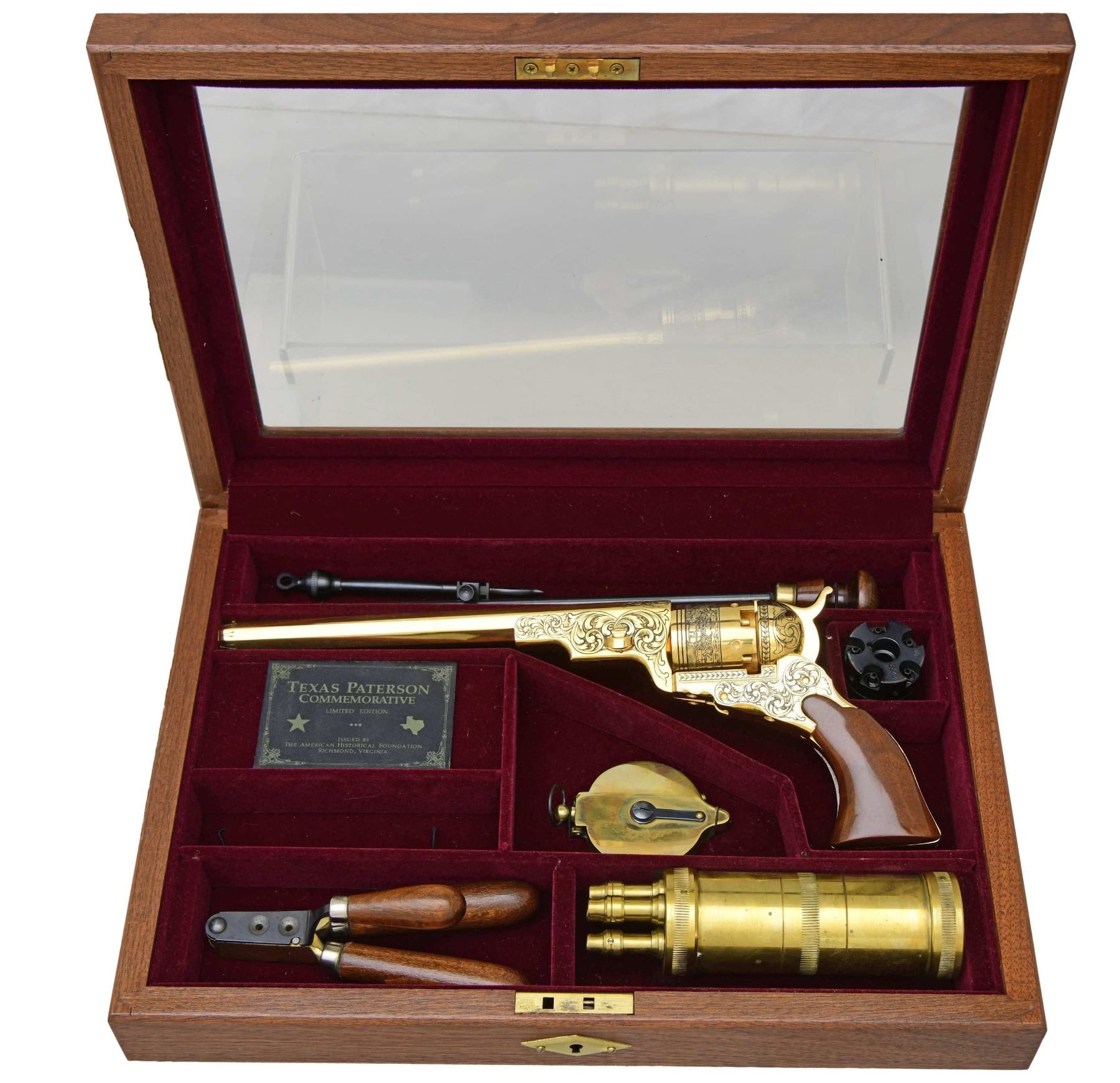COMMEMORATIVE REVOLVER. Cal. 36. S# 322 of 950. Bbl. 9" octagon. Five shot round cyl. Cyl. has stagecoach scene roll engraving. Frame & sides of bbl. have vine type foliate scroll ornamentation. Full 24 karat gold-plated finish. Folding trigger. 1 piece walnut grip. Mfg. in Italy by Pedersoli. UNATTACHED ACCESSORIES: glass fronted hardwood display case w/ burgundy velour fitted interior. Case contains spare blue finished cyl., Paterson style powder flask, 2 cavity bullet mold, loading tool & cleaning rod. CONDITION: near excellent, appears unfired. Cyl. has a faint drag line. PROVENANCE: From the lifelong Collection of Jim Williams. (01-25479/DS). ANTIQUE. $1,500-2,250.