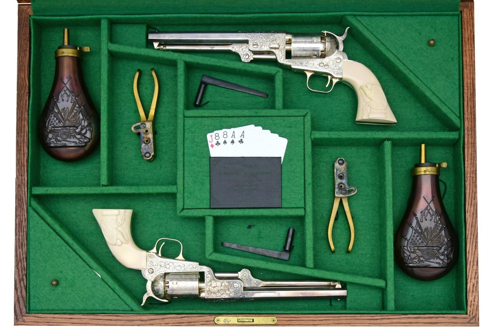 1851 NAVY REVOLVERS. S#: JBH100 & JBH101. This attractive set was presented as the "Best of Show" award by the Colorado Gun Collector's Association at their 2012 Denver show. The winning display, titled "Winchester Model 42 Elite Grades," was the winner among a field of 78 displays. Both cals. are .36. Bbls. are 7 1/2", octagon with cone-type sights. Six-shot round roll-engraved cyls. Bbls., frames, grip straps, loading levers, and hammers have 75% coverage of open-pattern foliate scroll hand engravings. Full silver finishes. Synthetic ivory American Eagle grips. A limited edition of 500 was issued as a tribute to "Prince of Pistoleers," as Bill Hickok was known. These ornate revolvers were issued only in pairs, as Hickok always carried two. Mfg. in Italy by Uberti. UNATTACHED ACCESSORIES: original glass top French fit case with segmented green interior. The centerpiece of the case is a synthetic leather commemorative plaque holding a dead man's hand (aces & eights) of playing cards. The case also holds two powder flasks, two nipple wrenches, two bullet molds, and the case key. CONDITION: both revolvers appear unfired. Silver finishes have acquired light-age-related tarnishes. The right grip panels show some age-related yellowing. (01-24679 & 01-24680/DS). ANTIQUES. $2,000-3,000.