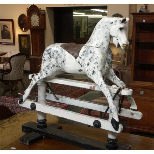 HOBBY HORSE: A hand painted and hand carved American child's hobby or rocking horse, circa 1890-1900, 34'' x 36'' x 14'', wear and losses to paint and leather noted.