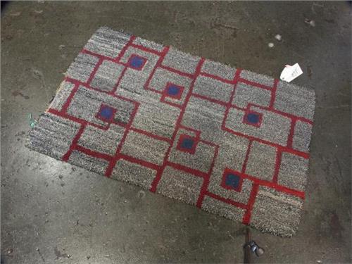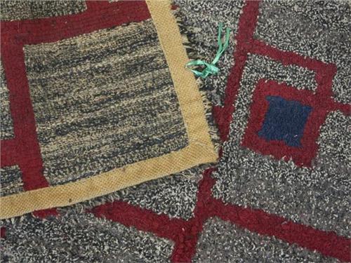 TEXTILE: American hooked rug with red and blue geometric motif, black marl ground. Likely second quarter 20th c. Note losses at corners, one edge. Approx. 30.5'' x 48''