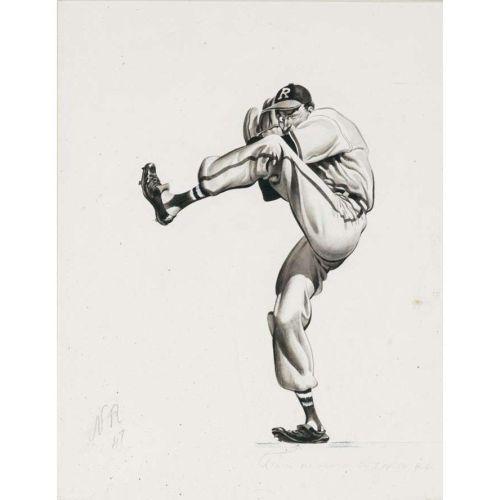 1 AMERICAN ILLUSTRATION Baseball Pitcher 12"x 9" ink on paper signed "N.R. 47" lower left CONDITION REPORT: excellent with light splatter staining. PACKING AND SHIPPING (excluding insurance) by Fairfield Auction to points within the Continental U.S.A. and Canada (all other international must be handled by 3rd party shipper) $30.