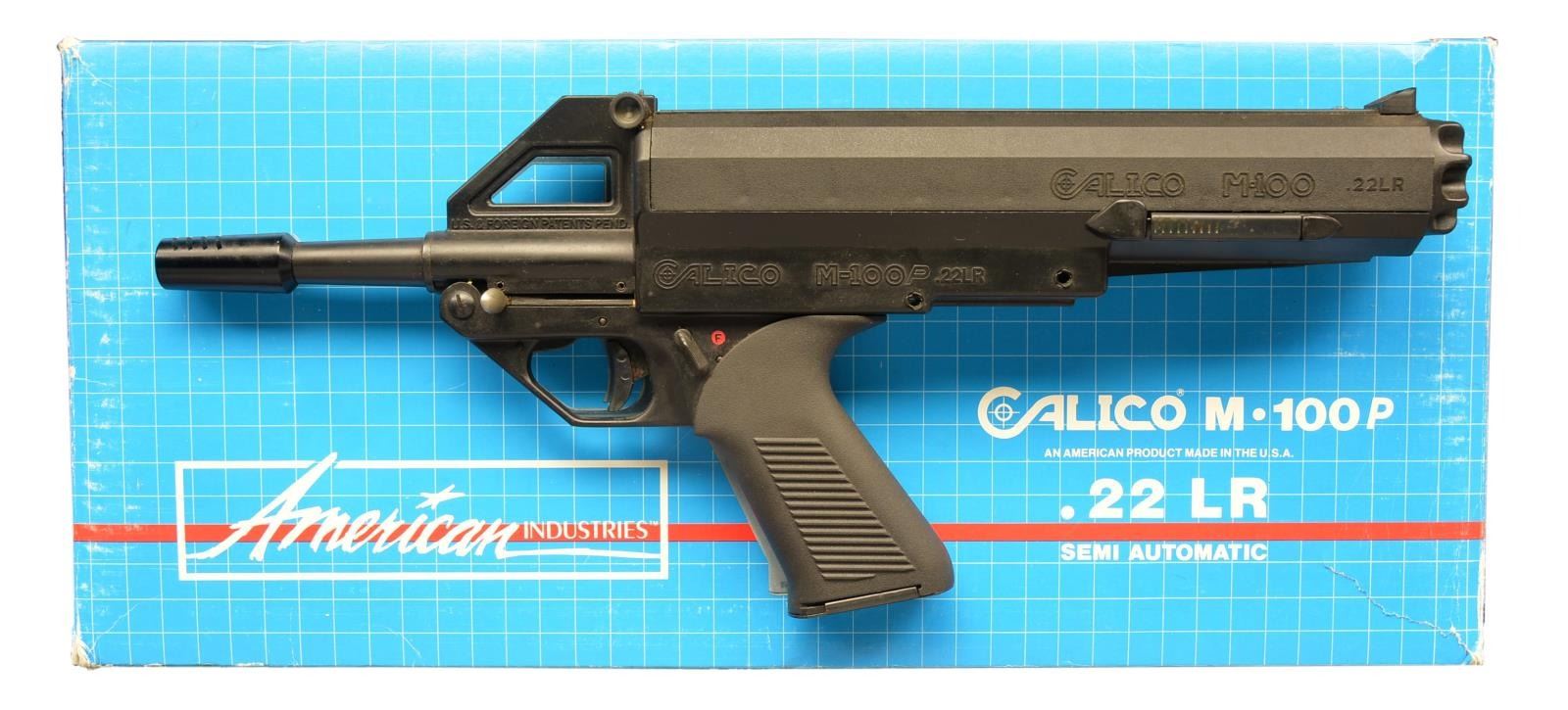 Cal. 22 LR. S# G005465. Bbl. 6" w/ muzzle brake. Mfg. 1989-2001 & 2007-date in various locations; this pistol mfg. 1998-2001 in Bakersfield CA. Matte black polymer construction w/ fixed rear sight on mag. body & windage adj. front on frame. Ambidextrous safety & left side cocking handle. Futuristic appearance w/ extremely high capacity. MAGS: 1 factory 100 rd. UNATTACHED ACCESSORIES: original box & packaging. CONDITION: all aspects near excellent appears new. (20-2605/NW). MODERN. $450-600.