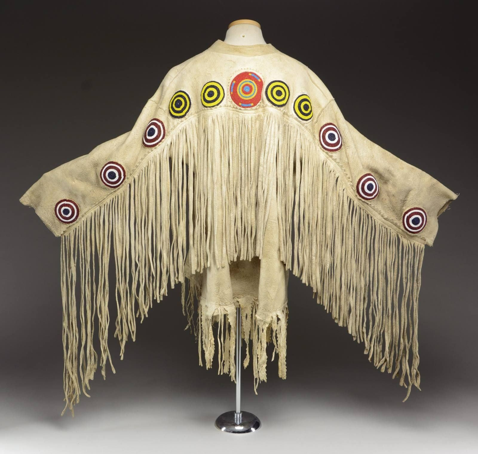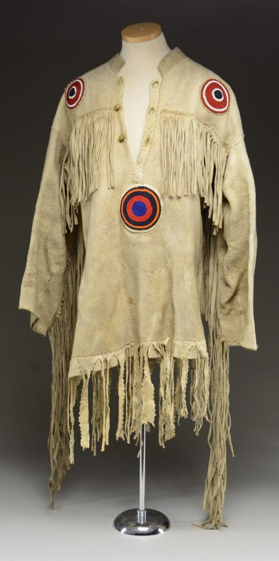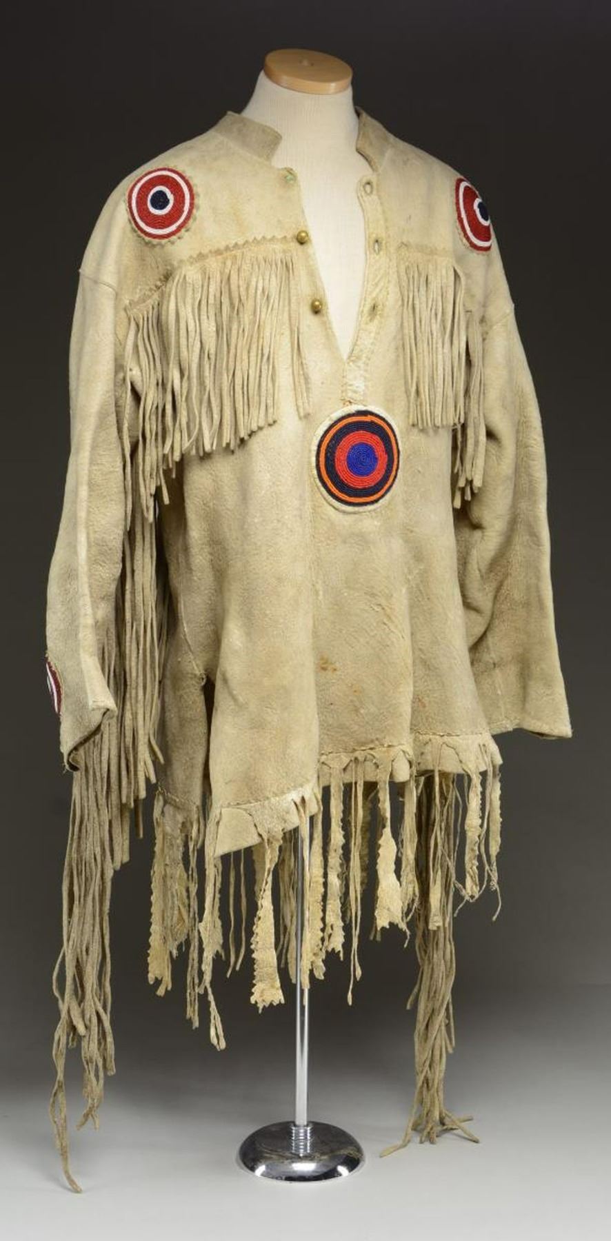 Attractive well-made unlined pull over jacket/shirt with 14 multicolor beaded “bullseye” designed round panels measuring from 3-4.5”, 2 brass ball buttons, rawhide fringed. CONDITION: very good overall, soil and stains, originally had 3 buttons, one missing. (02-21014/JS). $1,000-1,500.