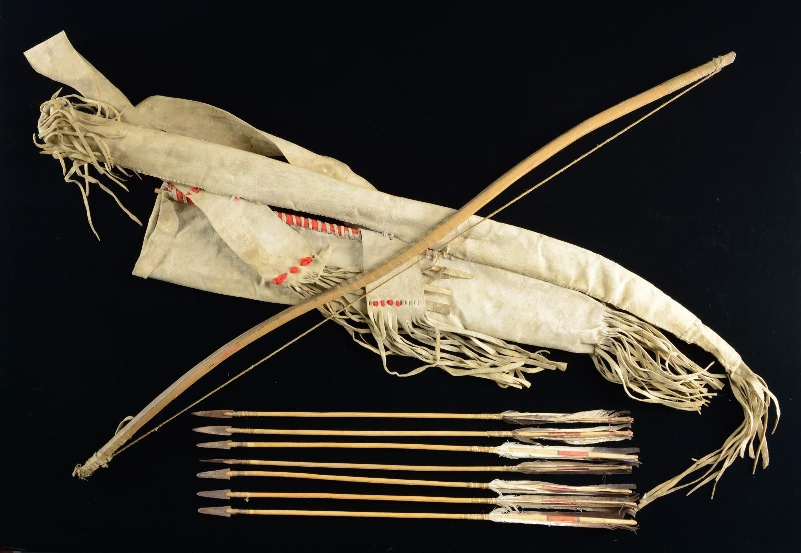 AMERICAN INDIAN BOW, ARROWS, QUIVER / BOW POUCH.