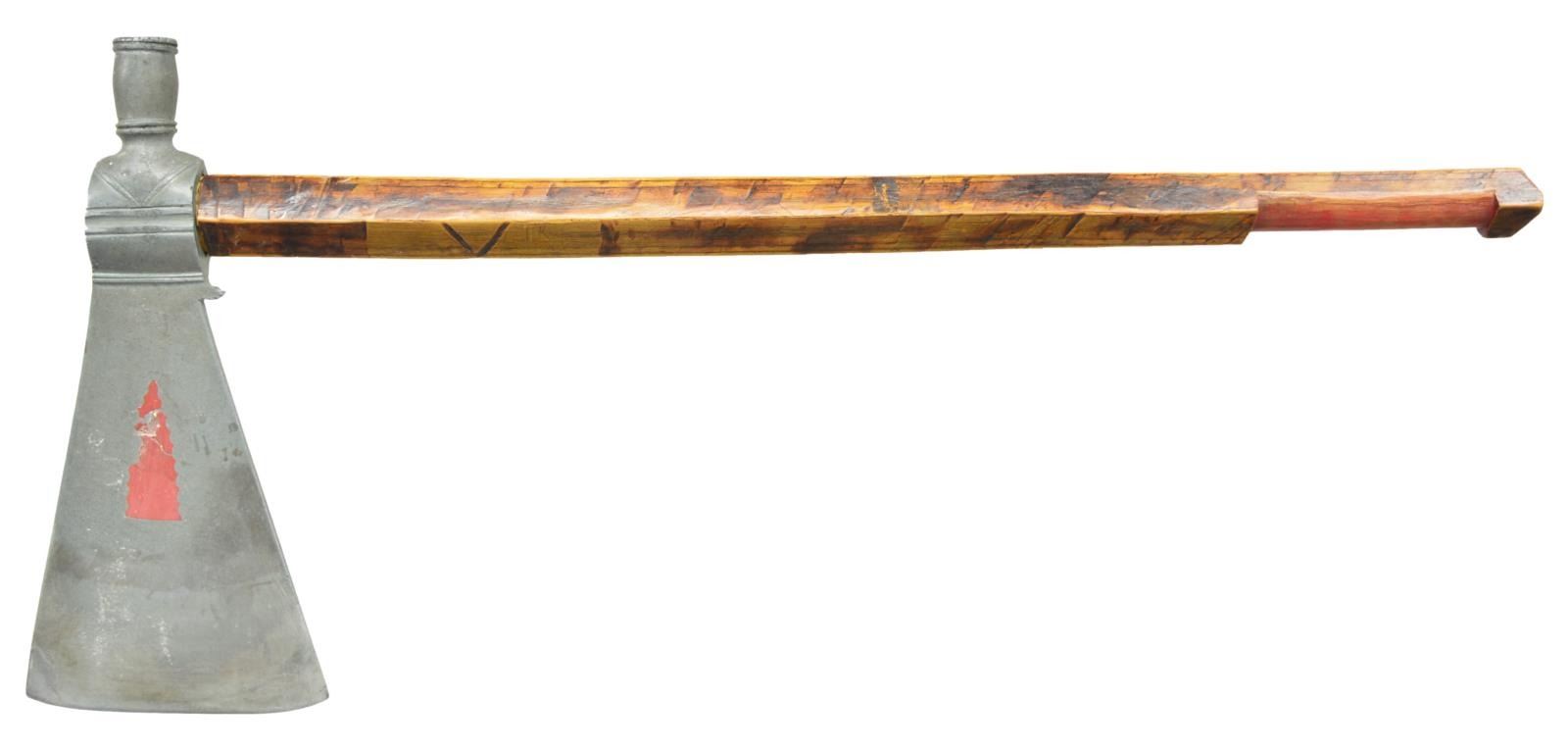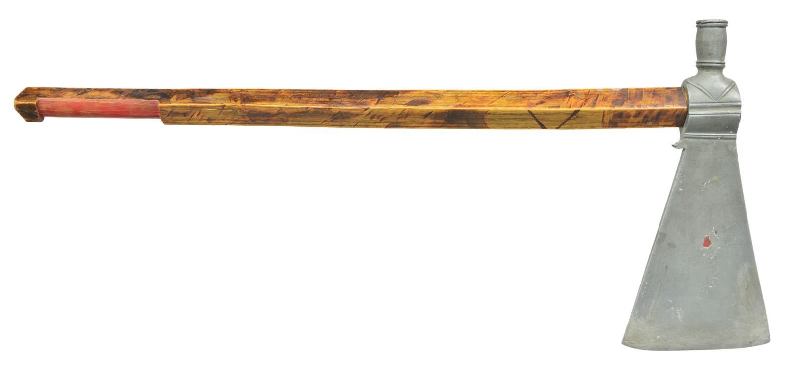 INLAID PEWTER HEAD & FULL HAFT. Overall length: 19 1/2". Head length: 9 1/4". Blade length: 4 1/4". A ceremonial pipe tomahawk likely dating from the 1890's and possibly from the Blackfoot tribe featuring a large cast pewter head with red catlinite inlaid arrow point design. The 1 1/2" tall bowl has ringed decoration at the top and bottom. There is lineal decoration at the molding and a chevron below the bowl. The haft is diamond shaped in cross section with a smoothed 3 1/4" area just up from the base. The haft has some pyrographic embellishments throughout its length. CONDITION: the head shows some wear with the pipe bowl being slightly out of round. The catlinite inlay is cracked with minor losses. The haft remains quite strong and solid. (02-17710/BF). $2,500-3,000.