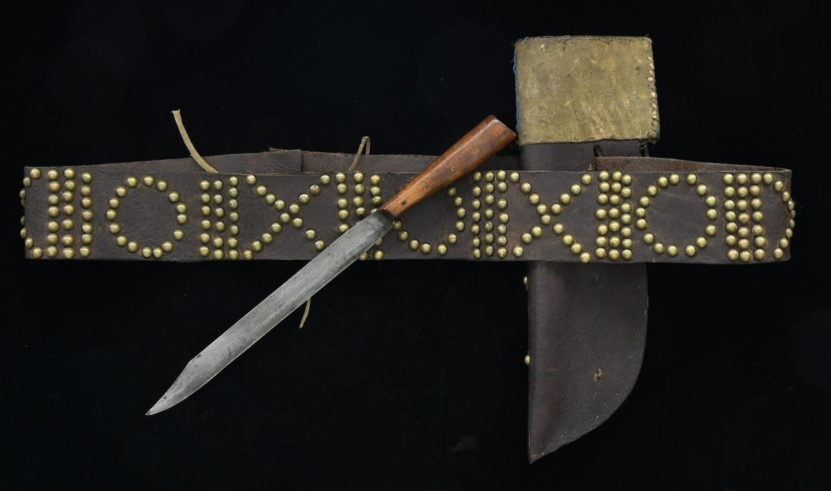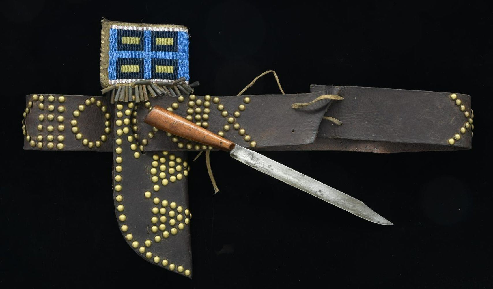 BELT, KNIFE & SHEATH. 3”wide, 51” long belt with alternating X & O tack designs, sheath has triangle shaped tack designs with 3” x 4” blue, yellow, pink, and white beaded area at throat, row of tinkle cones. 15” wood gripped knife with very sharp 10” thin blade. CONDITION: good to very good overall. (02-21013/JS). $600-800.