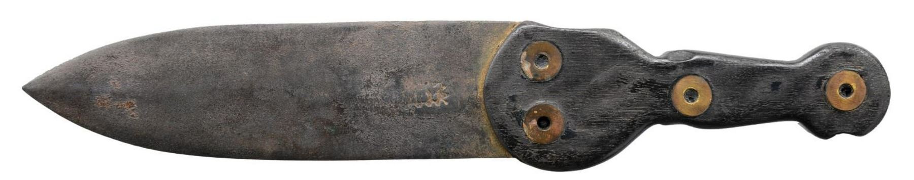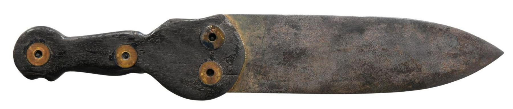 12.5” overall, 7.25” double edged wide dagger blade with partial large “SORBY” mark, 5 large brass washers in distinctive dag type wood grip. CONDITION: good-very good overall as artificially aged blade. (02-21007/JS). $400-600.