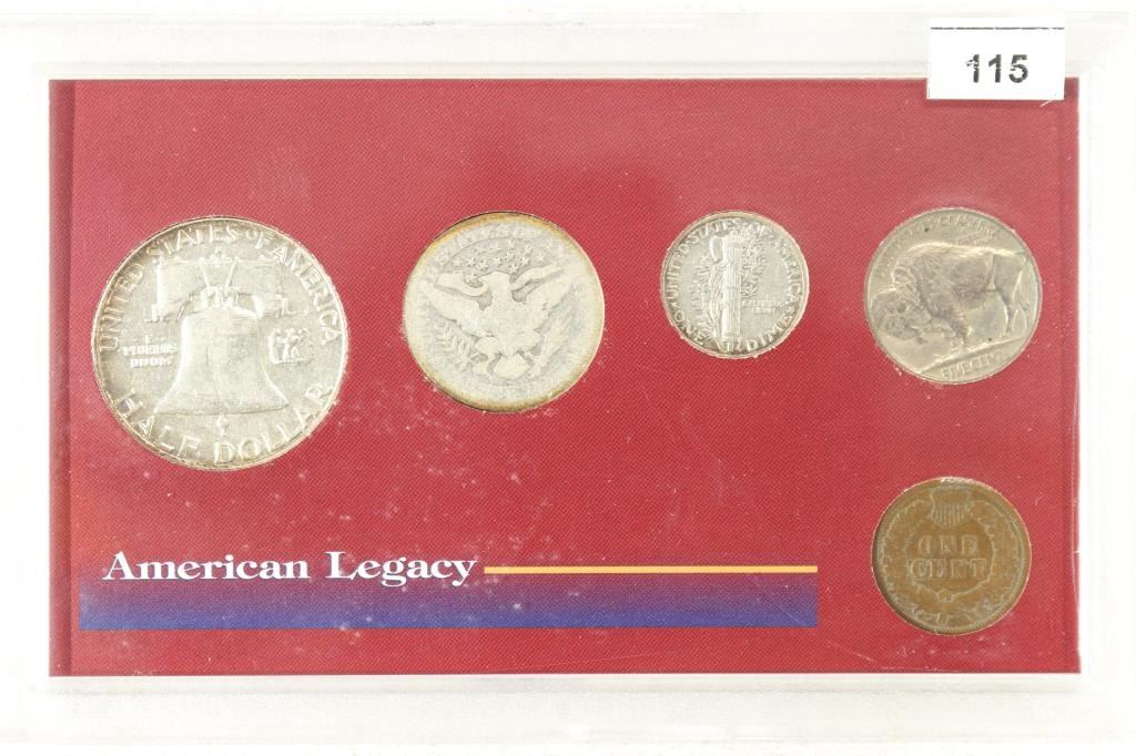 INCLUDES 1907 INDIAN HEAD CENT, 1937 BUFFALO  NICKEL, 1943 MERCURY DIME, 1916 BARBER  QUARTER AND 1962-D FRANKLIN HALF DOLLAR