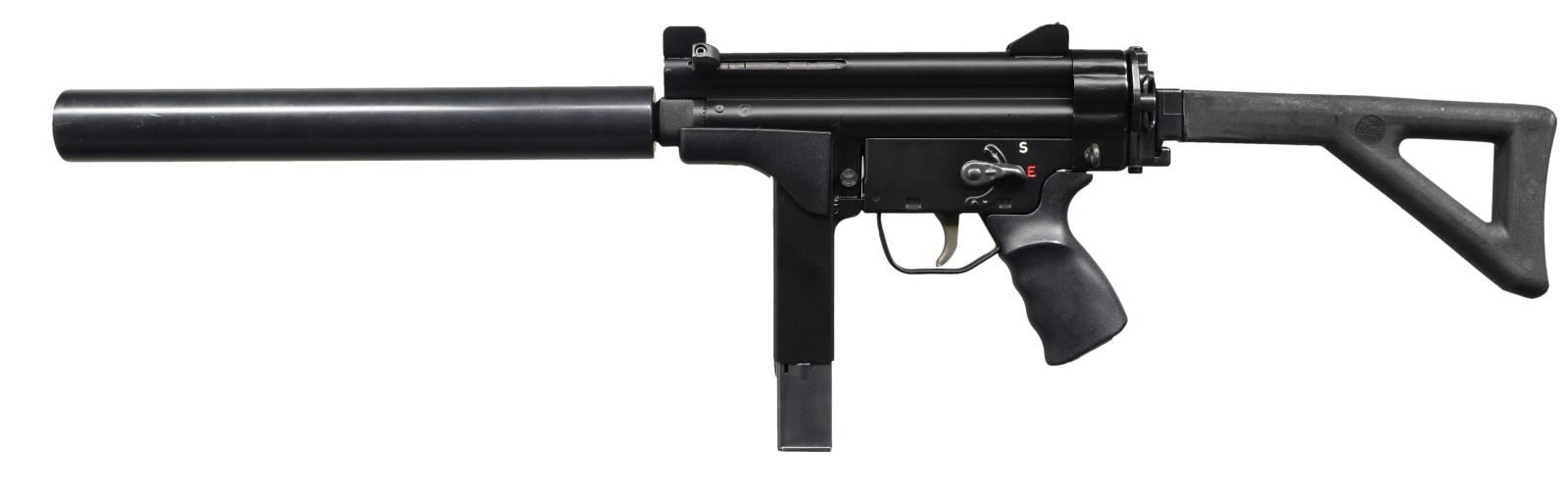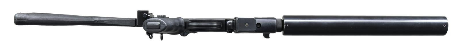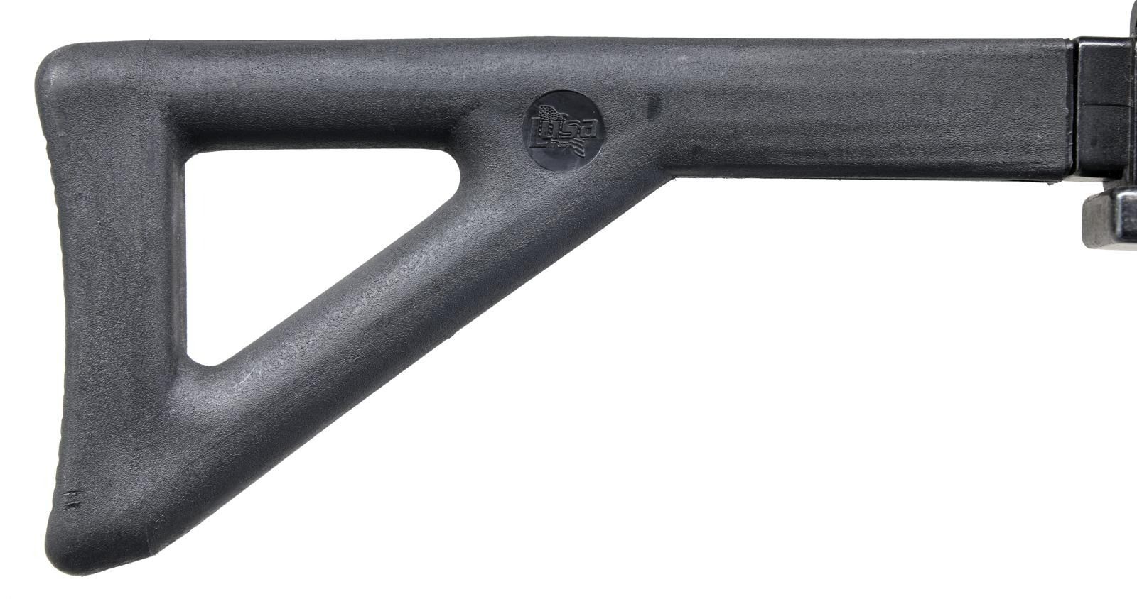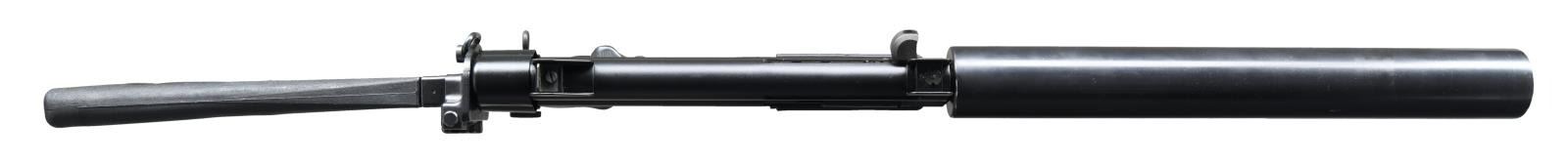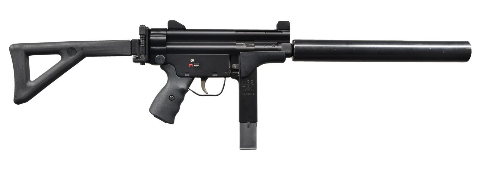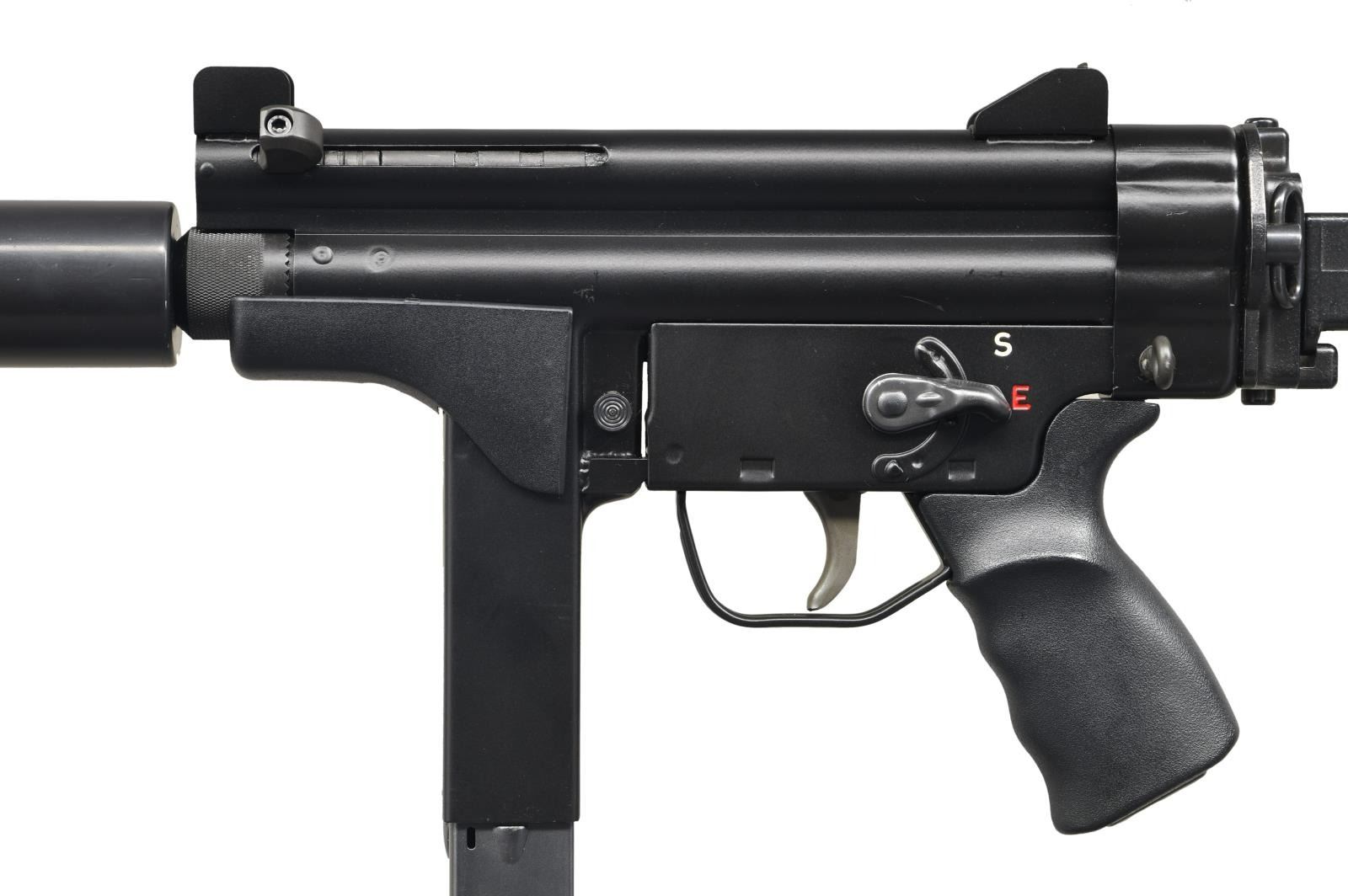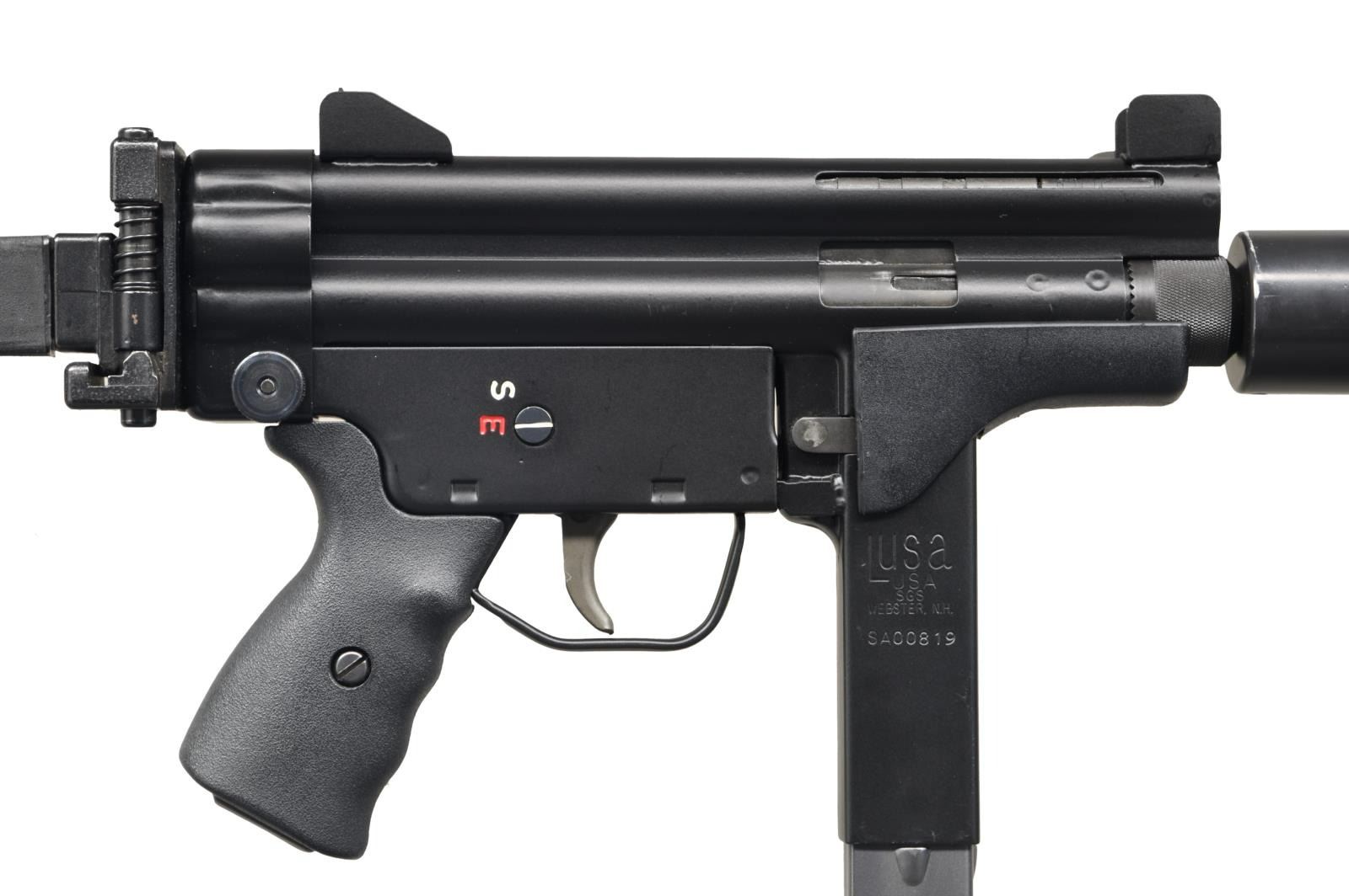 Cal. 9mm. S# SA00819. Bbl.16.25". Originally designed in Portugal by INDEP in 1993. The name "LUSA" derives from Lusitania, which was the Roman name for the Iberian region that covers present day central and southern Portugal and part of Spain. Aesthetically it has recognizable features primarily from the MP5 family, even utilizing the same trigger pack. Originally designed with military & law enforcement in mind, the project was discontinued in 1992. In 1994 INDEP sold the dies, tooling, fixtures and manufacturing rights to Stan Andrewski, owner of Stan's Gunsmithing in Webster New Hampshire and the LUSA USA went into production as a closed bolt, recoil operated system. This particular example is a carbine. Matte black finish on all exposed metal surfaces. Right side folding stock, similar to the HK PDW stock. Protected post front sight, adjustable for elevation. Protected peep fixed rear sight. Left side, non reciprocating charging handle. 13" faux suppressor over barrel, weighing in at 6 ounces. Left side controls on steel "S-E" trigger group & mag release, located forward of trigger group. Overall weight w/ empty mag, 8 pounds, 6 ounces. MAGS: 1 steel 30 rd. CONDITION: all aspects indicate very little use, if any. Finish enjoys complete & consistent coverage w/ the majority of wear limited to areas of mechanical intervention, which happens almost immediately. Stock locks tightly when extended. Bore is bright w/ strong rifling. Fire control mechanism appears to function correctly when cycled by hand. (23-2323/JZ). MODERN. $400-600.
