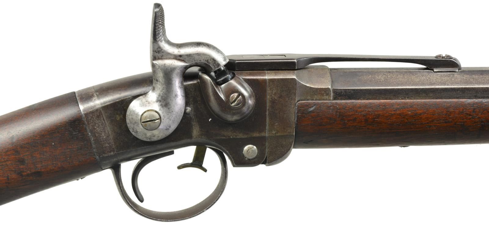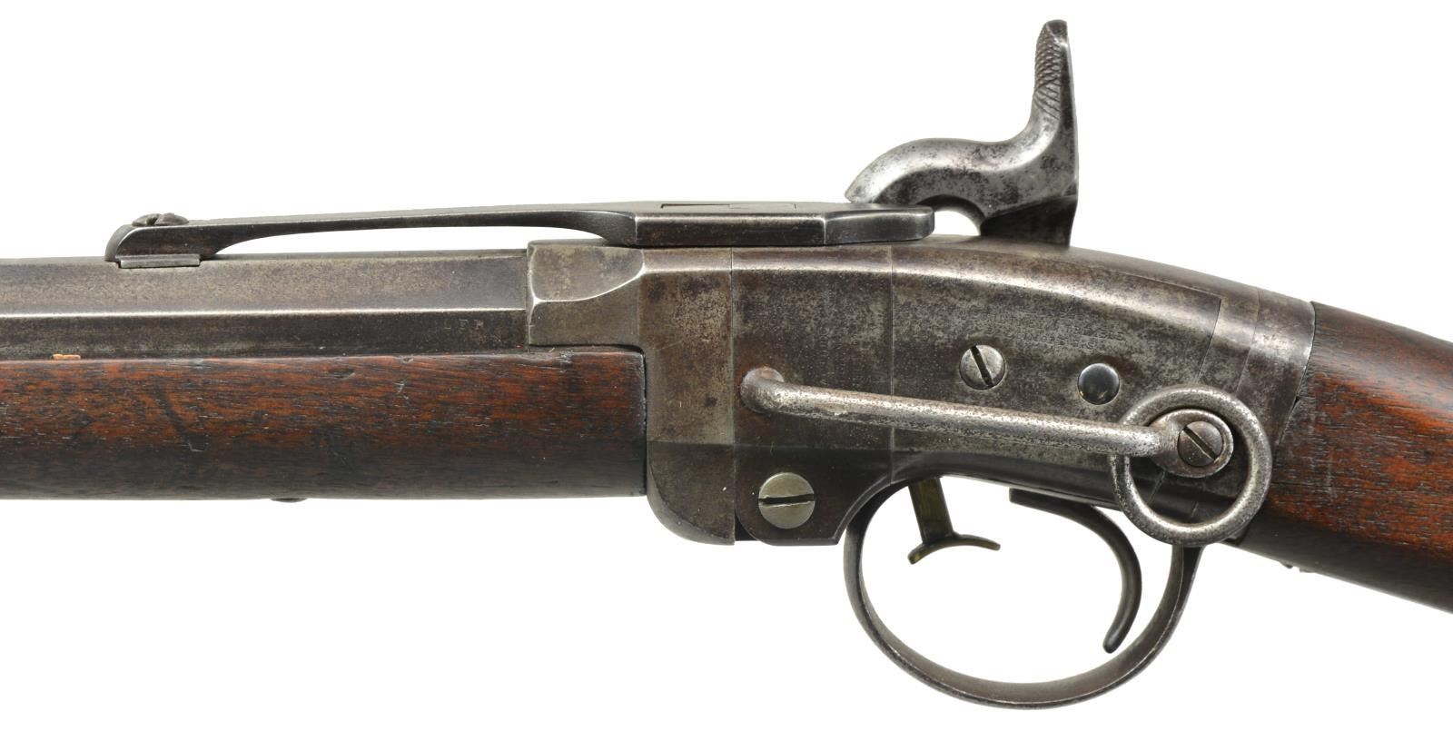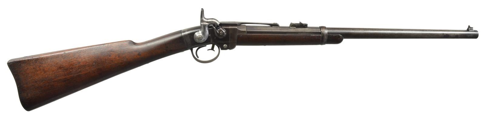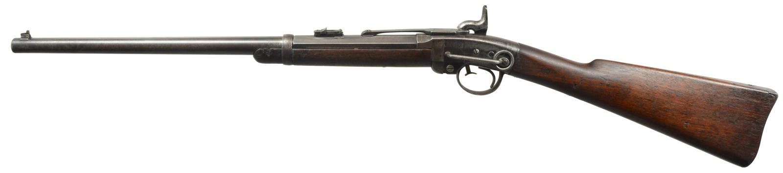 PERCUSSION SRC. Cal. 50. S# 3014. Bbl. 21 5/8" rnd. w/ oct. shank. Front sight has replacement blade. Graduated leaf rear sight. Action is activated by a brass push rod that allows bbl. to pivot downward for loading. Left side of action has saddle ring & bar. Band fastened walnut forearm & straight grip stock w/ steel carbine buttplate. Left side of stock has lightly visible "JH" cartouche. CONDITION: metal finish fading to gray w/ scattered pitting. Bbl. hinge screw is replacement. Replacement nipple. Wood has dark worn appearance showing dents & handling marks. Sm. chips & cracks around action & toe. Bore retains lightly worn rifling. (01-18373/DS). ANTIQUE. $900-1,200.