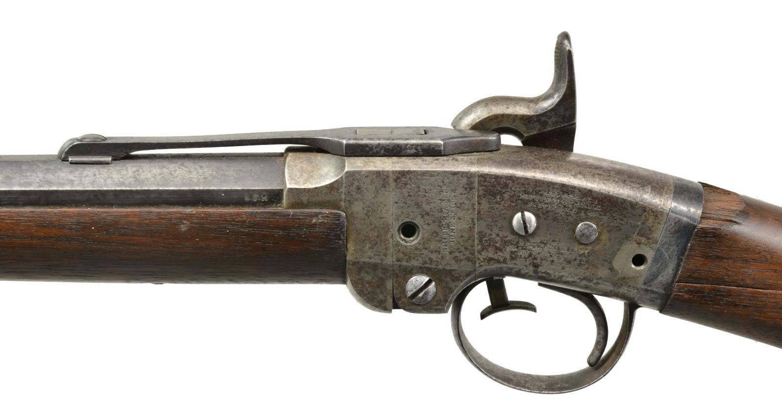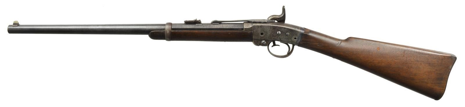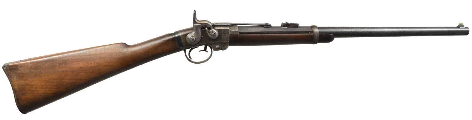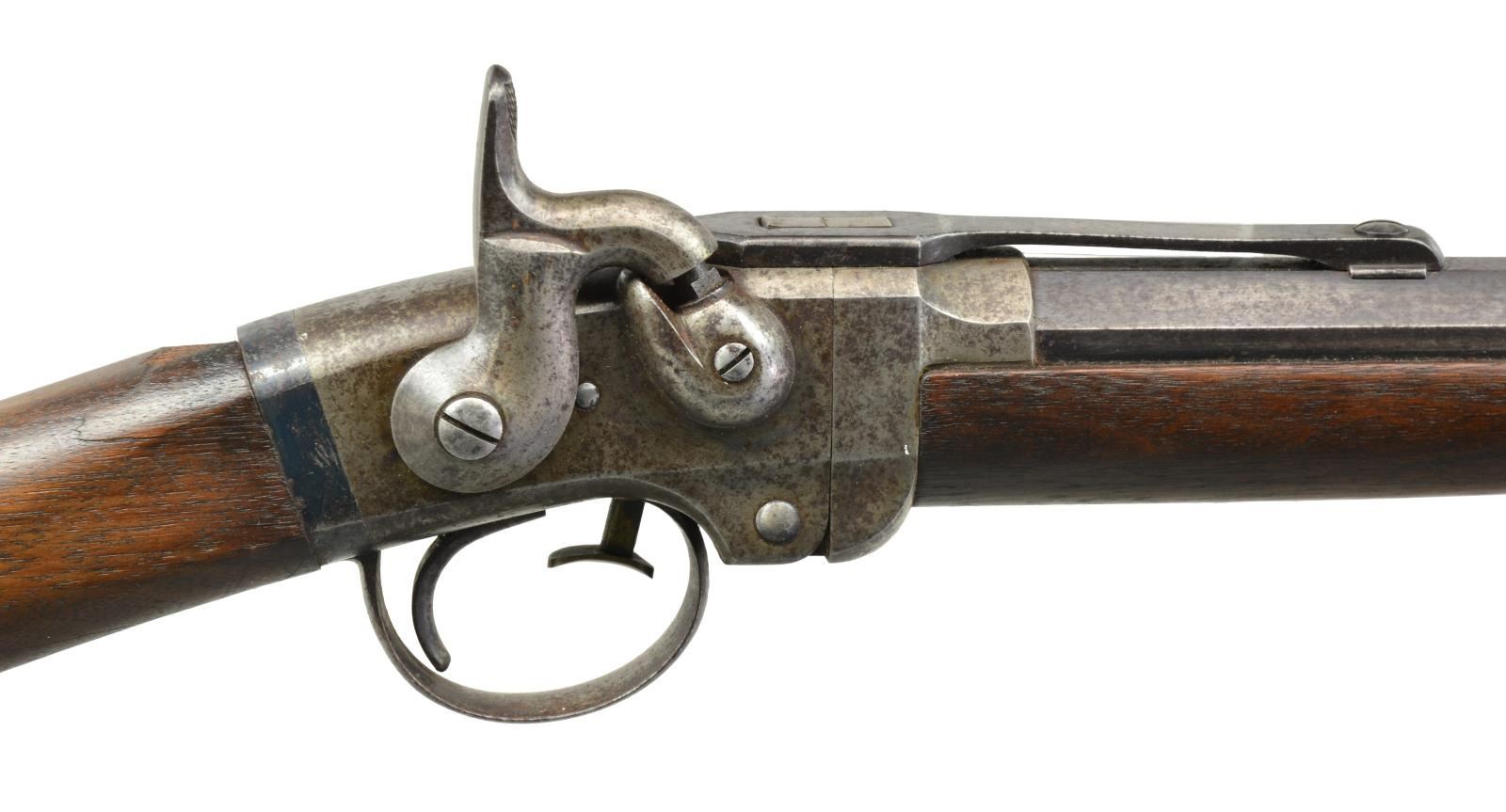 PERCUSSION CARBINE. Cal. 50. S# 11909. Bbl. 21 5/8" rnd. w/ oct. shank. Blade front sight w/ graduated leaf rear sight. Action is activated by a brass push rod that allows bbl. to pivot downward for loading. Band fastened walnut forearm & straight grip stock w/ steel carbine buttplate. Left side of stock has "JH" cartouche. CONDITION: bbl. retains 30% dull faded blue blending w/ surface corrosion & light pitting. Action finish has faded to gray showing corrosion. Saddle ring & bar are removed. Forearm has lightly worn appearance. Stock is cracked at head w/ lg. chips behind action & at toe of buttplate. Bbl. is loose at hinge. Action lacks spring tension. Bore retains largely intact rifling showing scattered pitting. (01-18357/DS). ANTIQUE. $500-800.