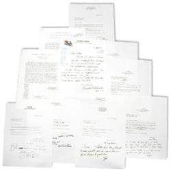 <b>1058. AMERICAN MILITARY FLYERS </b>Fine lot of 12 items signed by prominent military pilots and aces, some with excellent content. Many of the items are penned at the bottom of letters sent to the flyers, including <b>FRANCIS GABRESKI</b> ("<i>I don't know why I showed no interest in having my aeroplane painted for distinctionÉ</i>"), <b>ROBERT HITE</b>, <b>JAMES HOWARD</b> ("<i>My nose art depicted our squadron symbol - the Panda BearÉ</i>"), <b>JAMES RIGG</b>, <b>CHASE NIELSEN</b>, <b>HAROLD FISCHER</b> ("<i>Sharks teeth [were painted on the noses] because the orientals reportedly were afraid of sharksÉ</i>"), <b>ROBERT DE HAVEN</b>, <b>JOE FOSS</b>, <b>HUBERT ZEMKE</b>, with an A.L.S by <b>RALPH PARR</b>, and typed manuscripts signed by <b>CLYDE EAST</b>, <b>GEORGE CHANDLER</b> and <b>REX BARBER</b>. Overall very good to fine.<b> $150-200</b>
