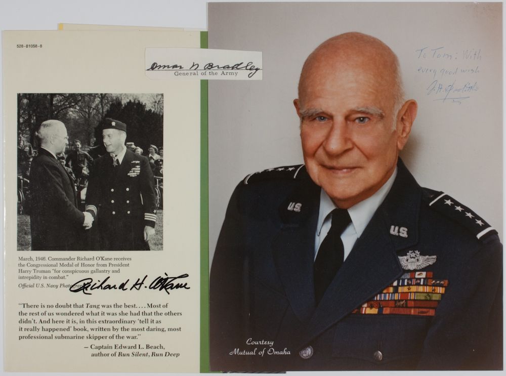Group of items signed by three WW II prominent military men. Includes: I.S.P. 8" x 10" color of JIMMY DOOLITTLE American aviator and Tokyo air raider, showing him in uniform later in life, a clipped signature of OMAR BRADLEY, general and later Chairman of the Joint Chiefs, and a signed book cover from his memoirs by M.O.H winner RICHARD O'KANE. A fine group.