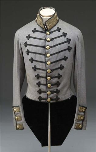 AMERICAN MILITIA ARTILLERY OFFICER'S COAT C. 1845. Gray wool tailcoat with 10 US eagle "A" buttons down the front. Buttons are "W.H. HORSTMANN & SONS - PHI". The buttonholes are edged with black braid, which is carried out onto the front of the coat to form a trefoil. Tall standing collar has 4 eagle "A" cuffs and gold bullion facings. Sleeves are 6-1/2" at elbow and 4" at cuff. Cuffs are decorated with gold bullion braid around each of the eagle "A" cuff buttons. This jacket is lined with a light brown polished cotton lining. There is a pocket inside the left tail. Les Jensen, in his letter of authenticity, states, "The tailoring and configuration of this piece indicate an American militia, Artillery officer's coat dating to about 1845. The ‘Prussian collar' is seen in American uniforms beginning about 1825, and the waist seam also dates in the 1820's. The button type is a bit later, leading to the 1845 date for this piece. The use of Artillery officer's buttons, along with golf braid, rather than worsted, trim likely indicates an officer's coat. Further research might well identify the company. Most likely, based on the rate of other survivals, it is from one of the northern cities, likely Boston, New York or Philadelphia. One possibility is the Philadelphia Grays. Conclusion: This is a particularly fine condition militia officer's coatee from an American militia artillery company, c. 1845. It appears to be completely original." CONDITION: Coat overall is very good. Areas of staining and soiling. Minor moth damage. A few small 1/4" holes. A few seam separations. 4-56259 JS254 (2,000-4,000)