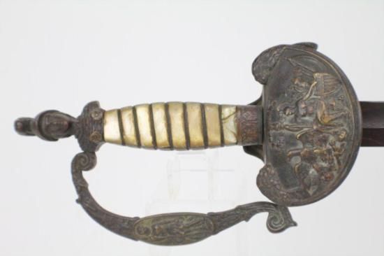 ET0617120001 AMERICAN MILITIA FIELD OFFICER'S SWORD Circa 1830s American Field Officer's Sword. 32in single edged straight blade with faded yet still visible intricate blue-gold etching from hilt to tip. Folding clamshell counterguard covers an etched ricasso, and is decorated with a brass eagle and an accompanying female freedom figure. The guard has more floral designs with another figurine. A wire bound mother of pearl grip is topped off with a knights-bust pommel. Overall good condition, tarnish and rust towards the tip of blade.