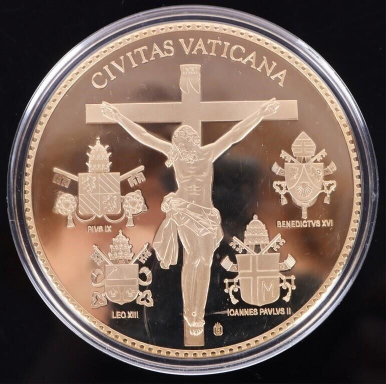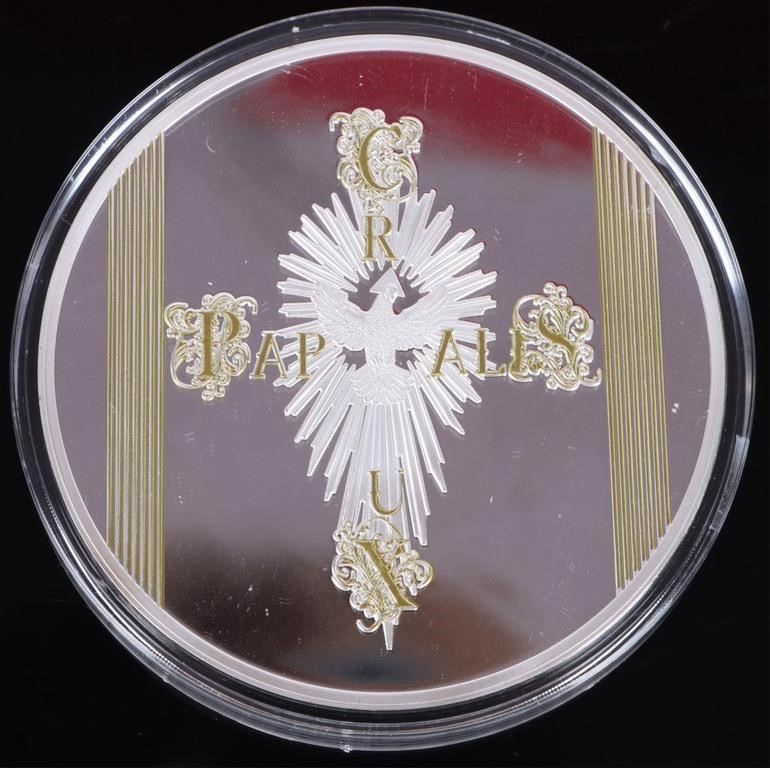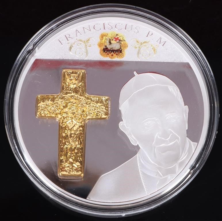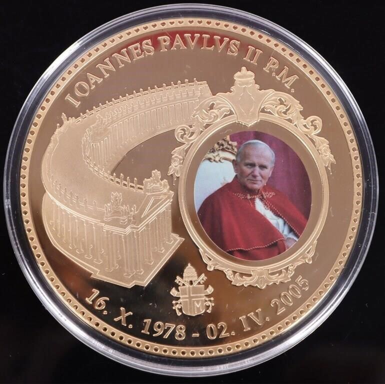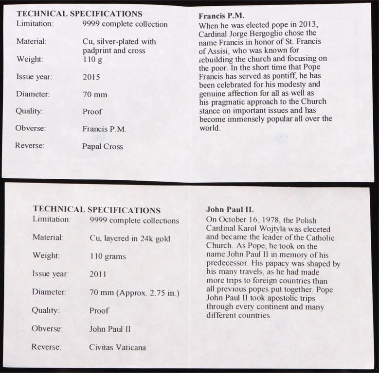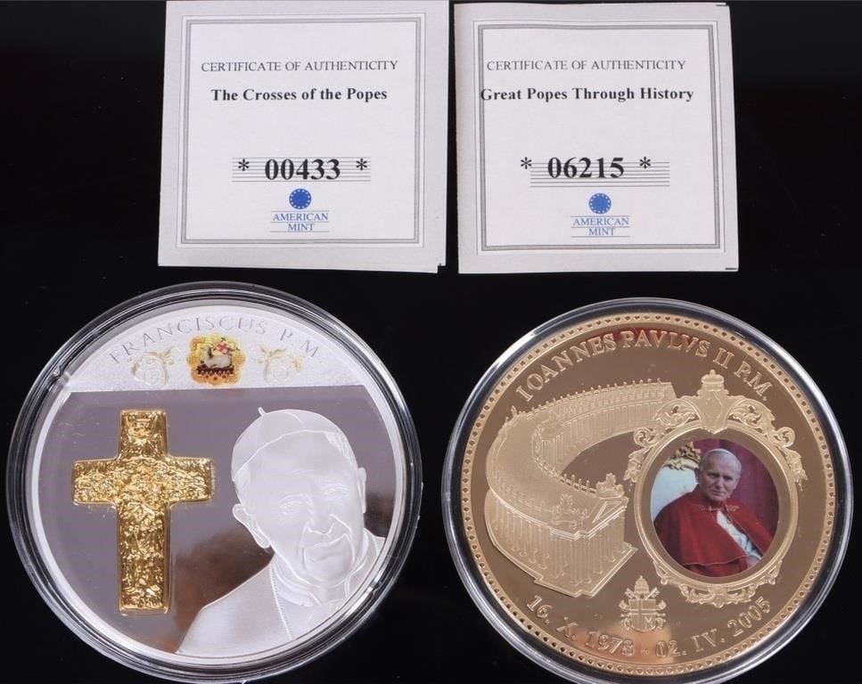 Amazingly detailed American Mint collectible commemorative proof coins to include Francis P.M. from the crosses of the Popes series and John Paul II from the Great Popes through History series. Both coins are copper layered in 24k gold.