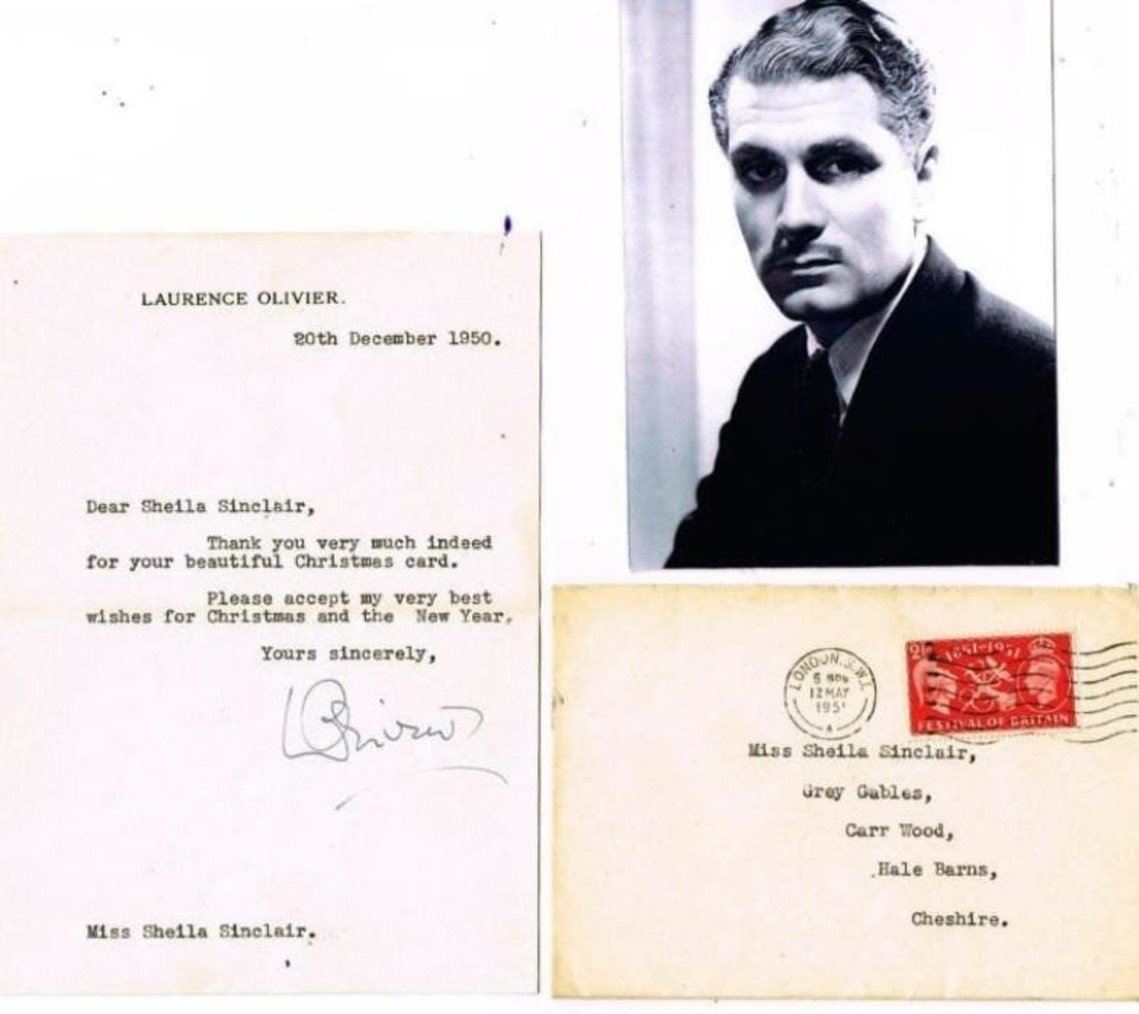 LAURENCE OLIVER SIGNED 1950'S LETTER (1907-1989) Vintage one page letter measuring 5.2 x 6.9 inches signed in blue ink by the late British actor Sir Laurence Olivier, thanking a fan for their xmas card. Supplied with a photo of Laurence Oliver and the original envelope that the letter came in. The letter has one crease across the middle where its been folded for the envelope. Letter dated 20th December 1950.