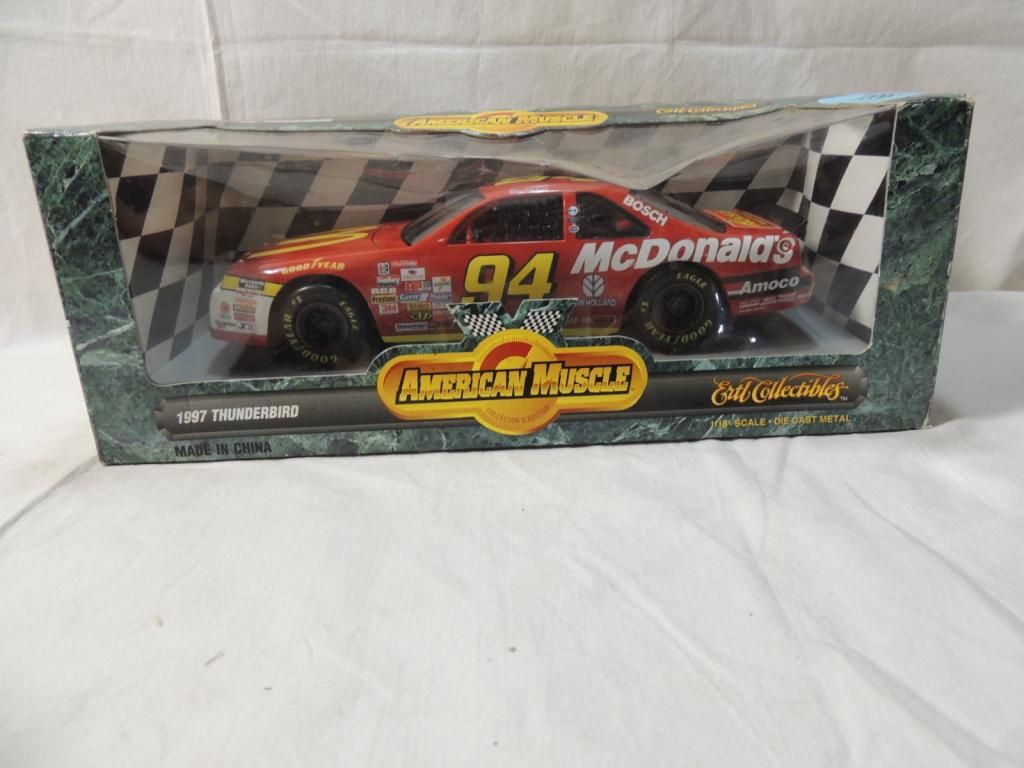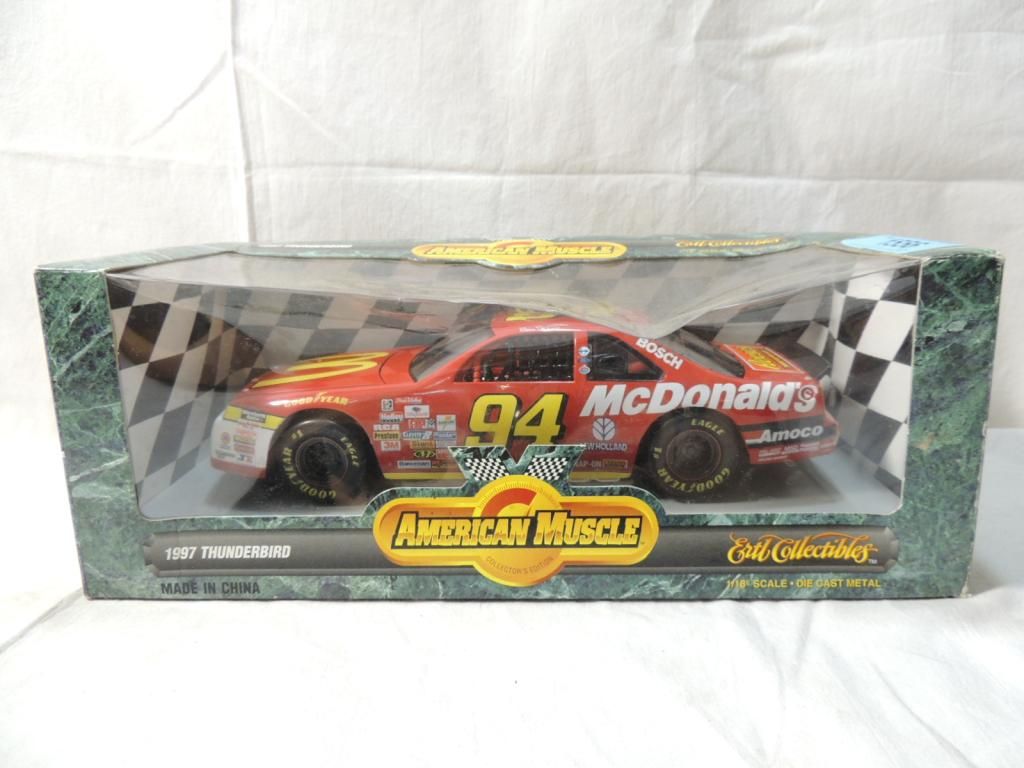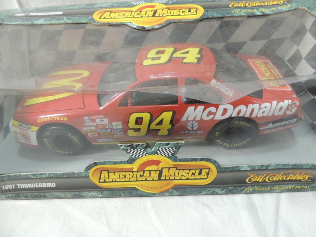 MCDONALDS NASCAR STOCK CAR #94 CAR. 1/18 SCALE DIE CAST METAL MODEL CAR. 1997 THUNDERBIRD. STEERABLE WHEELS, OPENING HOOD, DETAILED CHASSIS, COMPLETE INTERIOR WITH ROLL CAGE. DETAILED 600+ JP 358 CU IN V8 ENGINE. AS SHOWN. SEE PHOTO FOR MORE DETAILS.