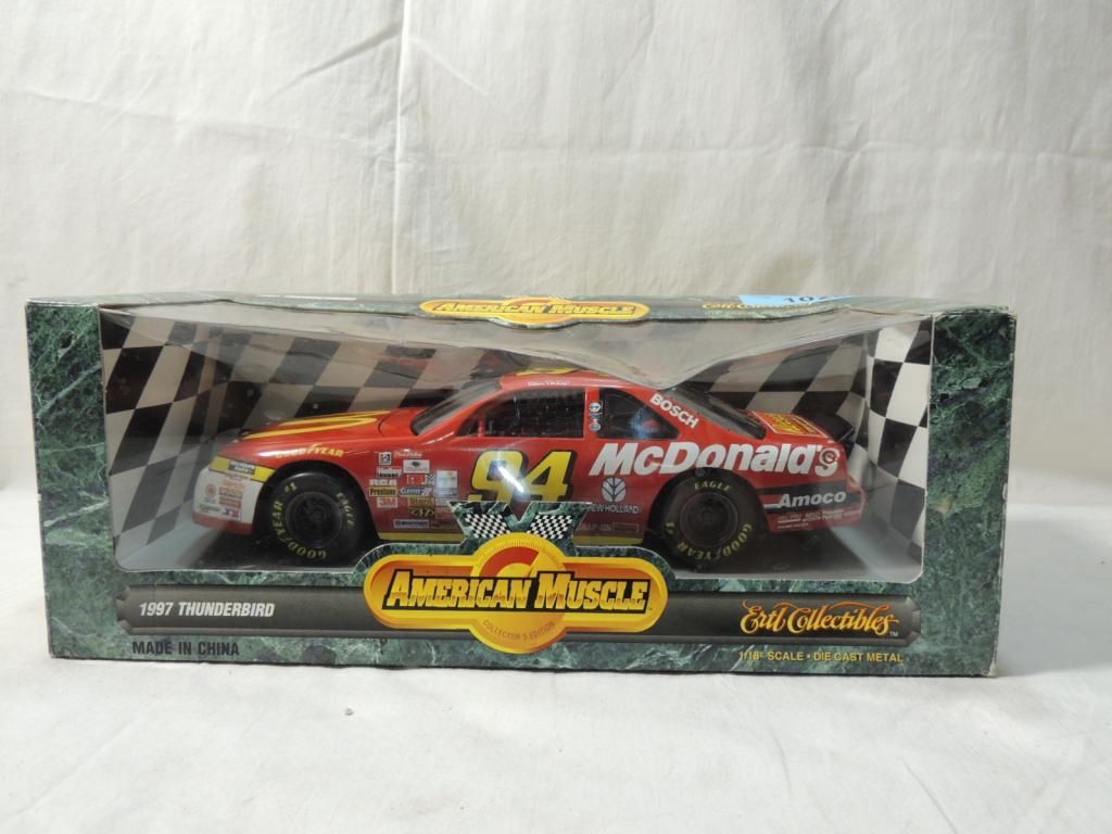 MCDONALDS NASCAR STOCK CAR #94 CAR. 1/18 SCALE DIE CAST METAL MODEL CAR. 1997 THUNDERBIRD. STEERABLE WHEELS, OPENING HOOD, DETAILED CHASSIS, COMPLETE INTERIOR WITH ROLL CAGE. DETAILED 600+ JP 358 CU IN V8 ENGINE. AS SHOWN. SEE PHOTO FOR MORE DETAILS.