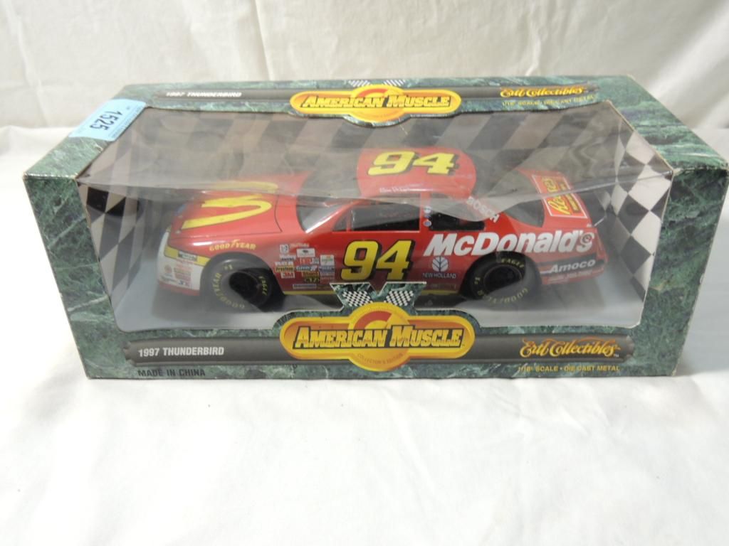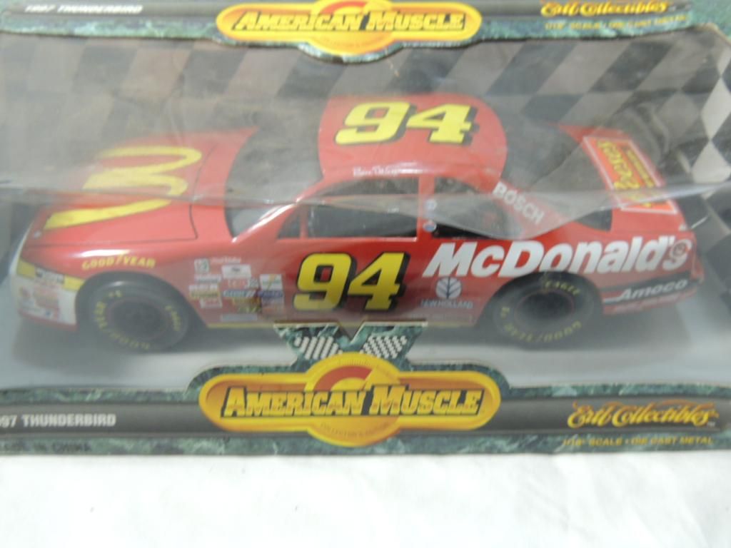MCDONALDS NASCAR STOCK CAR #94 CAR. 1/18 SCALE DIE CAST METAL MODEL CAR. 1997 THUNDERBIRD. STEERABLE WHEELS, OPENING HOOD, DETAILED CHASSIS, COMPLETE INTERIOR WITH ROLL CAGE. DETAILED 600+ JP 358 CU IN V8 ENGINE. AS SHOWN. SEE PHOTO FOR MORE DETAILS.