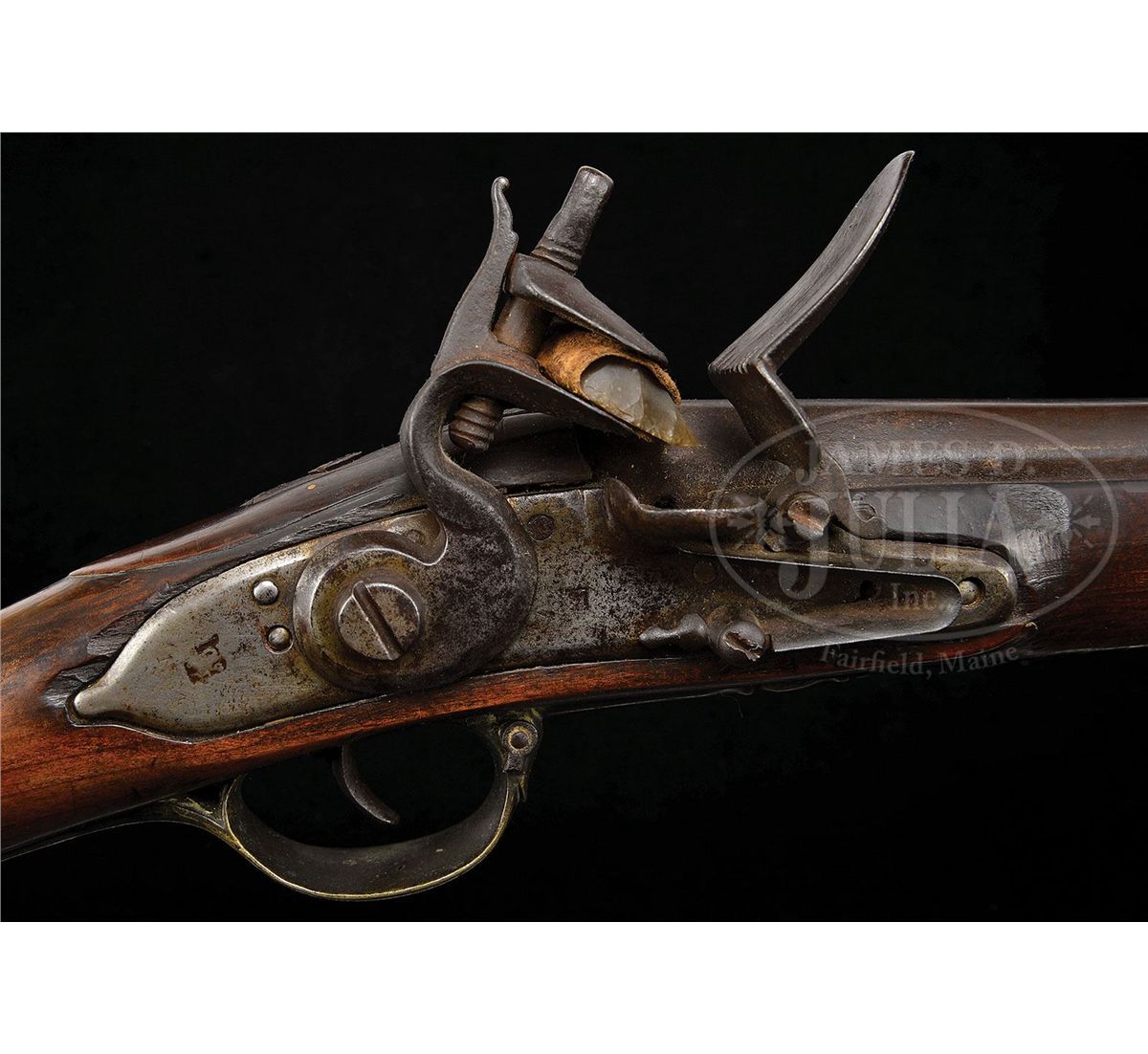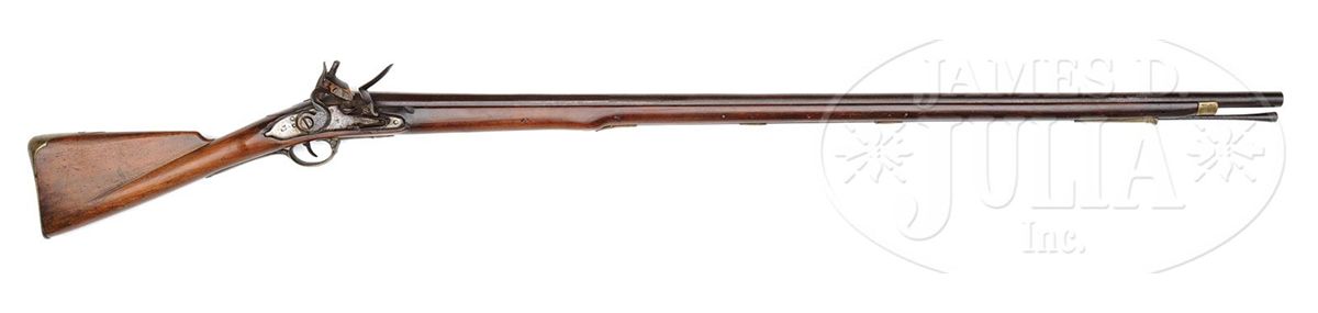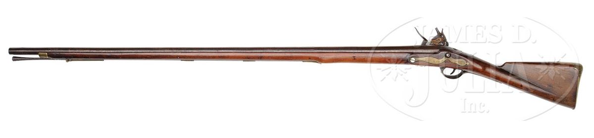 NSN. .75 Cal. x 46-1/2" long rnd bbl that is faceted at the breech for 16". Bayonet lug set back 1-1/4" on top of bbl and unmarked. 7" long lock is orig flint having a single bridle. Brass furniture consists of nose cap, 4 rammer pipes, trigger guard, 2-step buttplate tang and side plate all of British Short Land Pattern. 58-1/4" long stock appears to be American and probably stocked between 1780-1800. Trigger guard has provisions for a swing swivel, while the forearm does not. Trumpet shaped ramrod appears to be orig. PROVENANCE: Collection of Dr. Douglas Sirkin. CONDITION: All iron work shows dark patina with minor pitting around touch hole area and associated areas of lock. Forward lock screw replaced. Brass furniture shows its age very well, all in excellent condition. Stock is also in very good condition with only minor wood losses in front and behind lock, all very insignificant and does not detract from the overall appearance of the gun. This is a very good example of an American stocked musket assembled using metal work from salvaged muskets. 4-49903 PAS19