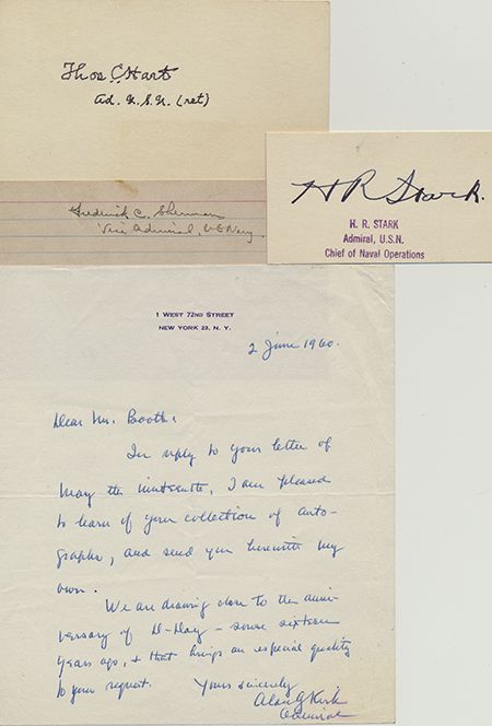 Lot of four signed items, includes: FREDERICK C. SHERMAN (1888-1957) Admiral who commanded Carrier Divisions I and II, led aerial attacks on Rabual, Iwo Jima and Okinawa, and participated in the battle of Leyte Gulf, signature and rank on a lined card; HAROLD R. STARK (1880-1972) Chief of Naval Operations, war-date signature as same; THOMAS C. HART (1877-1971) Commander of all Allied naval forces in the Far East, signature on a card; and ALAN G. KIRK (1888-1963) amphibious commander in the Mediterranean in 1942-43, (Allied invasion of Sicily and Italy), and senior U.S. naval commander during the D-Day landings of June 6, 1944, A.L.S. 1p. 8vo., New York, June 2, 1960 advising that he is pleased to learn of a man's collection and mentioning the 16th anniversary of D-Day. Overall very good.