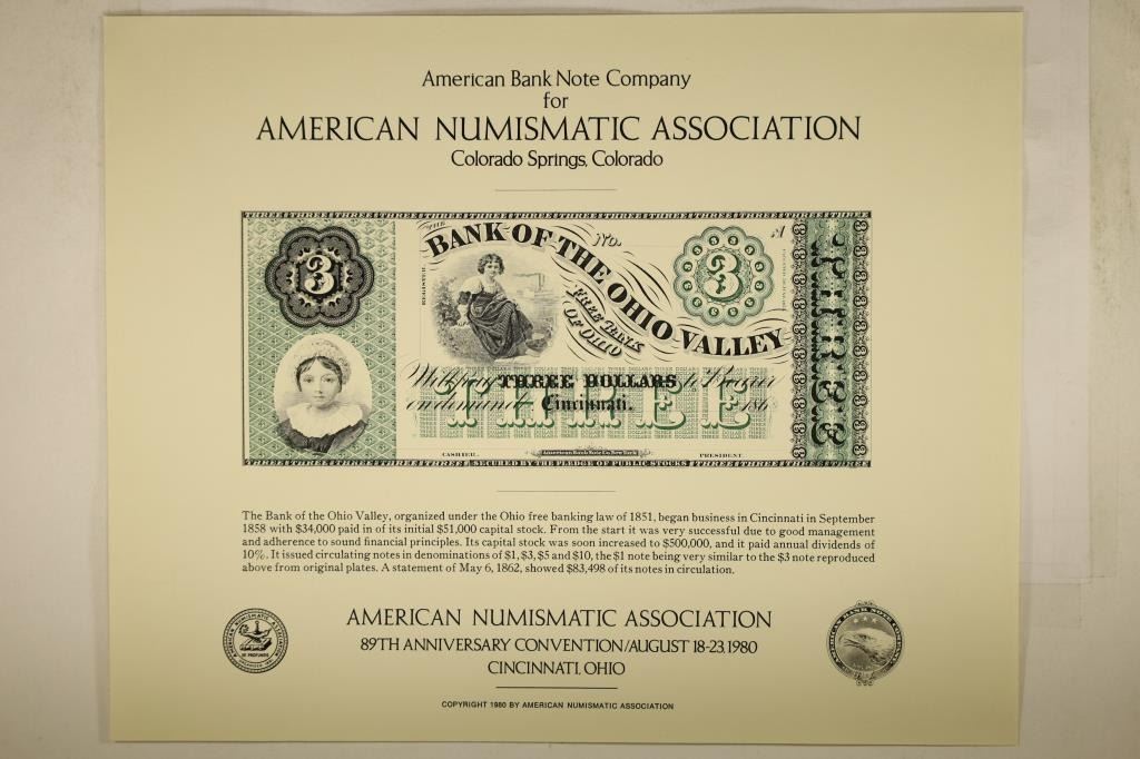 OHIO WITH INTAGLIO PRINTING OF THE FACE OF AN 1860'S BANK OF THE OHIO VALLEY $3, PRINTED BY THE AMERICAN BANK NOTE COMPANY