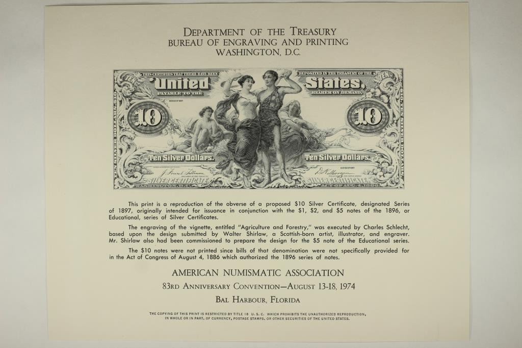 CONVENTION 1974 SOUVENIR CARD PRINTED BY THE BEP WITH REPRODUCTION OF THE OBV. OF A PROPOSED 1896 $10 SILVER CERTIFICATE