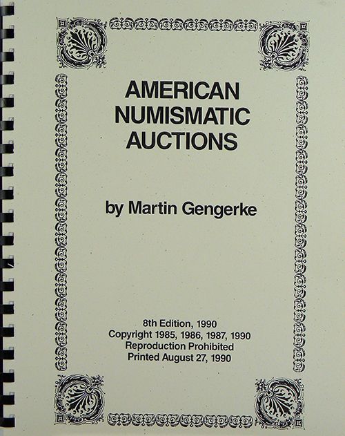 Gengerke, Martin. AMERICAN NUMISMATIC AUCTIONS. Woodside, 1990. Eighth edition. 4to, original spiral-bound plasticized card covers. (2), vii, (1), 271, (3) pages. Fine. A comprehensive, indispensable reference work listing over 13,000 American numismatic auction sale catalogues. The latest printed edition.