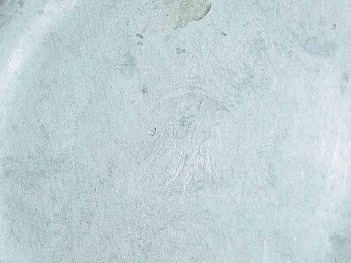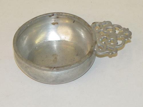 AMERICAN PEWTER PORRINGER SIGNED W.I.C. W/ EAGLE TOUCHMARK ON BASE & PIERCED HANDLE (1 1/8" T X 4 3/8" L W/ HANDLE) - LOSSES & IMPERFECTIONS