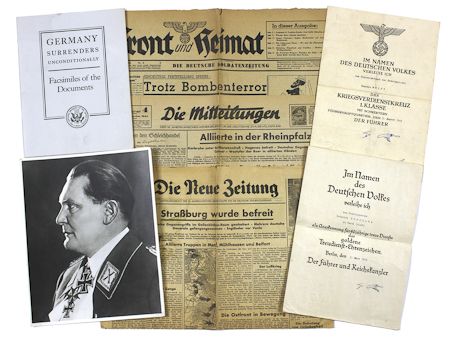 Grouping of various documents and ephemera, includes: appointments of a postal inspector and a oberstleutnant in the Schutzpolizei, both bearing printed signatures of Adolf Hitler (worn); copies of the newspapers Die Mitteilungen, Die Neue Zeitung and Front und Heimat; a 9 1/4" x 11 1/2" Hoffmann photo of Hermann Goring; a World War I Liberty Loan flyer (torn and chipped); an underground French newsheet Liberator, June 27, 1944, and an American propaganda leaflet headed "SUICIDE". Good to very good.
