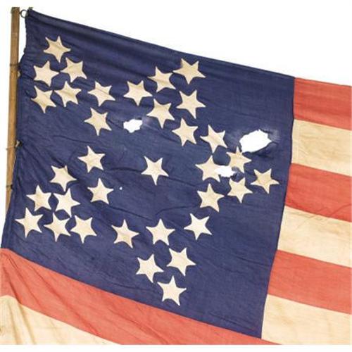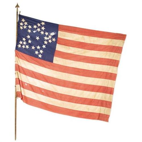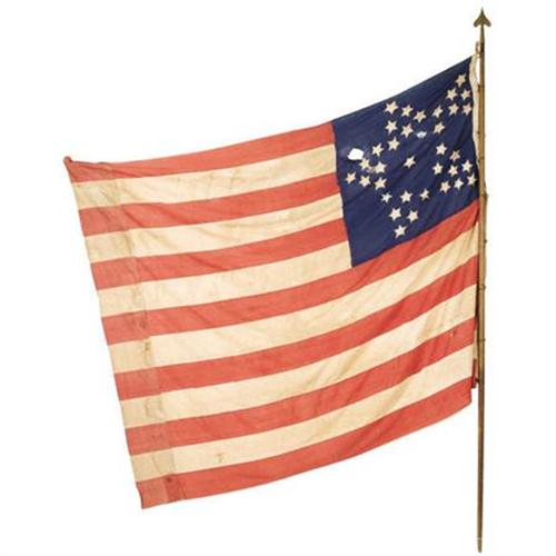 <B>AMERICAN REGIMENTAL CIVIL WAR FLAG - ‘GREAT STAR’ PATTERN ON ORIGINAL "SPEAR-POINT STAFF"</B></I> 69 inches high x 92 inches wide <BR><BR>With the admission of Kansas to the Union in January 29, 1861, the American flag included 34 stars at the outbreak of the Civil War. This regimental sized flag dates from the start of the war with the star pattern in the popular and attractive ‘Great Star’ pattern in the blue canton. With thirteen stripes in the red and white field, this pattern is highly desired among flag collectors for its folk art appeal.<BR><BR>Measuring 69 inches at the hoist and 92 inches at the fly, nine inches of the flag’s fly have been turned back and re-sewn toward the hoist. Made of wool bunting, the blue canton has a three inch hole as does the field. With a period spear point staff to which the flag is attached through its hoist with a coarse rope halyard, the hand sewn flag dates to the period of 1861 to July 4, 1863 when West Virginia was admitted to the Union.<BR><B><BR>Provenance: </B></I><I>Crow Art Partnership Collection Dallas, Texas.</B></I><BR><BR>This flag has been carefully examined by authoritative in-house experts and has been deemed to be authentic and of the period in every respect including fabric, thread, dye and the method and pattern of construction. Additionally, any accompanying provenance has been verified as unique and indigenous to the specific flag it documents.<BR><BR><b>Shipping:</b> Requires 3rd Party Shipping (<a target="_blank" href="http://www.heritageauctions.com/common/shipping.php">view shipping information</a>)