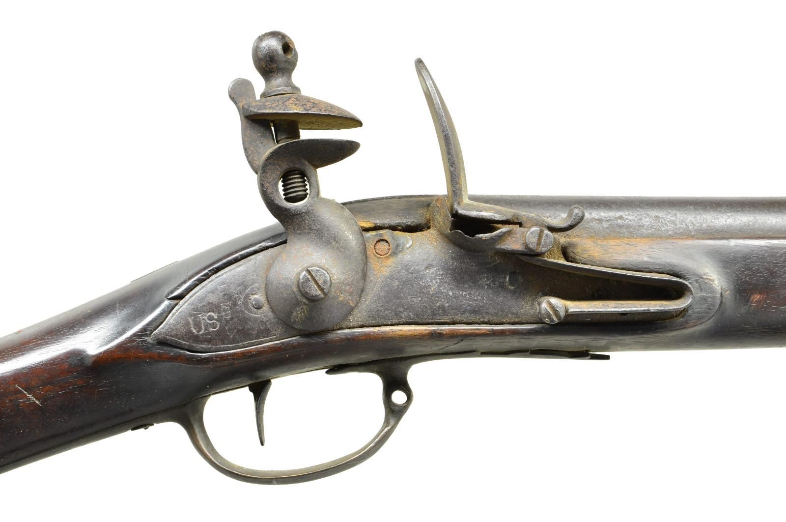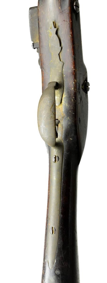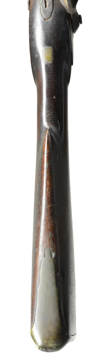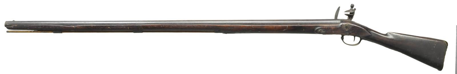 “US” SURCHARGED. Cal. 78. NSN. “Attic condition” 61” overall, 45” barrel from 1st model Brown Bess with indiscernible proofs, lock is also from 1st model Brown Bess, 1746 dated “JORDON” with “US” surcharge. Brass furniture from other European longarms, stocked in walnut, wood ramrod with 3 brass pipes, small rectangular thumb plate escutcheon. This is truly “as found” in the black survivor, uncleaned appears complete as assembled like so many other American guns of the Revolutionary War. CONDITION: very good overall, appears all original and matching as assembled in 18th century, barrel and lock have dark smooth iron patina, heavy wear and markings heavily worn and only partially discerned other than “US” surcharge added when original components already well worn when assembled. Stock is sound with hand worn patina, roughness to bottom of comb, brass has uncleaned dark olive patina. Mechanics function, clear smooth bore. (01-21756/JS). ANTIQUE. $3,000-5,000.
