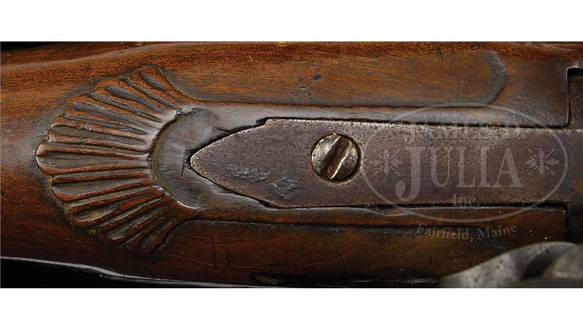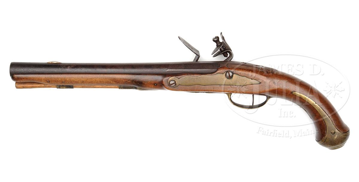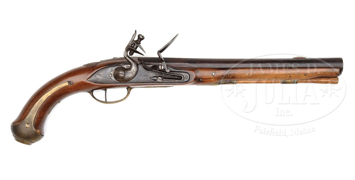 NSN. 10-1/2" .65 Cal smooth bore flat top rnd bbl. Apple wood stocked with fine relief shell carving to the rear of bbl tang. Crude brass buttcap is of the Harpers Ferry pistol style and long brass 2-screwed sideplate is rather crude and not engraved. All brass furniture is typically American and simply fashioned. Early flint lock is stamped "B HOMER". The Homer lock marking has been often encountered on Hudson Valley Fowlers and other Colonial era pieces. PROVENANCE: Frank Sujansky Collection. CONDITION: About 7" of forend has been replaced with matching apple wood and perfectly matched patina. Wood ramrod is a replacement. Wood forward of lock has been stabilized in period with iron nails. Buttplate may have been replaced in period. Front lock screw has stripped threads and needs to be replaced. 4-49467 RG50