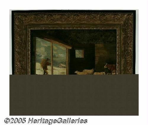 <B>AMERICAN SCHOOL (19th Century)</B></I><BR>Barnyard Scene<BR>Oil on canvas<BR>22.75in. x 29in.<BR><BR>Condition Report: Original unlined canvas, overall yellowing of surface from dirt and old varnish, small punctures in top left area filled with overpaint, 8in. band of overpaint along lower edge under sheep, raised bump from back lower center approx 3in. from bottom edge, 3/4in. loss along right edge filled with inpainting<BR>