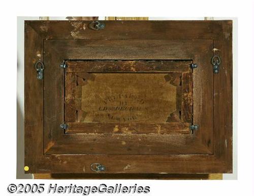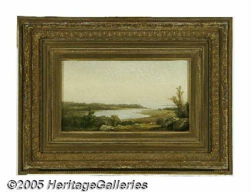 <B>AMERICAN SCHOOL (19th Century)</B></I><BR>Panoramic view fo a Bay<BR>Oil on canvas<BR>8in. x 14in.<BR><BR>Condition Report: Unlined original canvas, extensive inpainting in sky and around edges, two small areas of overpaint to right of figure, scattered inpainting in lower area<BR>