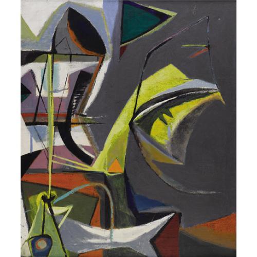 <B>AMERICAN SCHOOL (20th Century)</B></I><BR><I>Abstract Composition, 1952</B></I><BR>Oil on canvas<BR>32 x 38in.<BR>Stretcher signed "HNATT"<BR>Verso inscribed "M. Hnatt - '52"<BR> 1 Items <BR><BR><B>Condition Report:</B> Cracking to surface, with frame